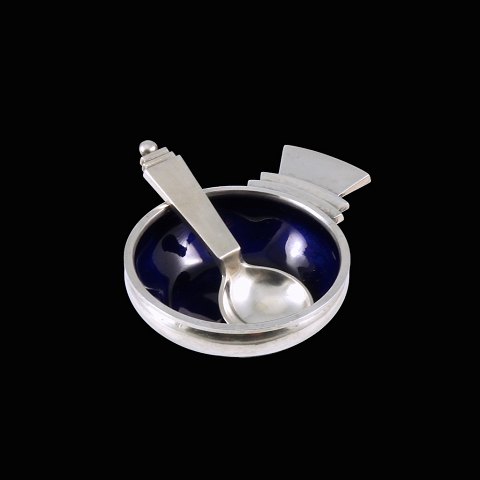 Georg Jensen. Saltkar #102 i sterling sølv med blå emalje med tilhørende ske 103 - Pyramide.