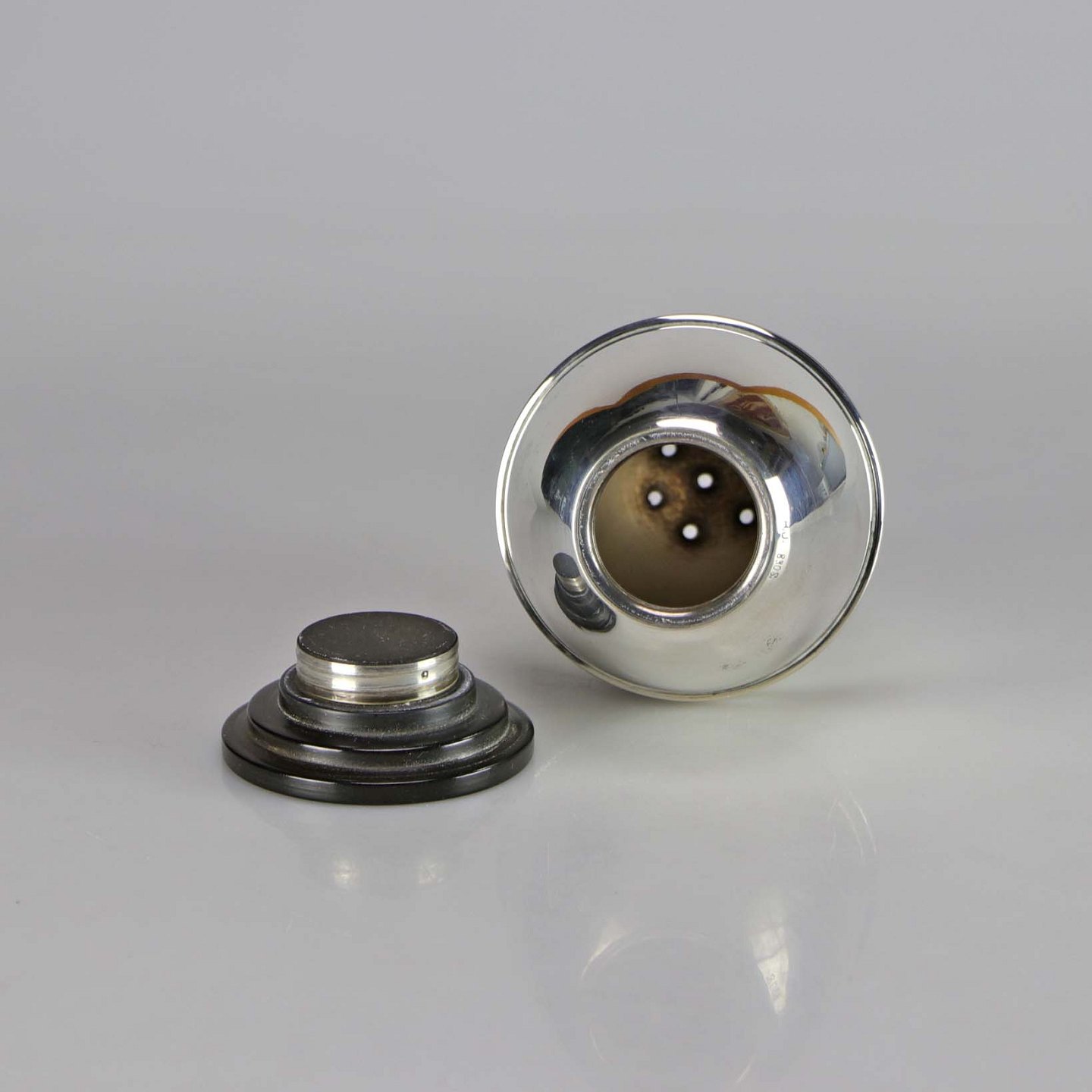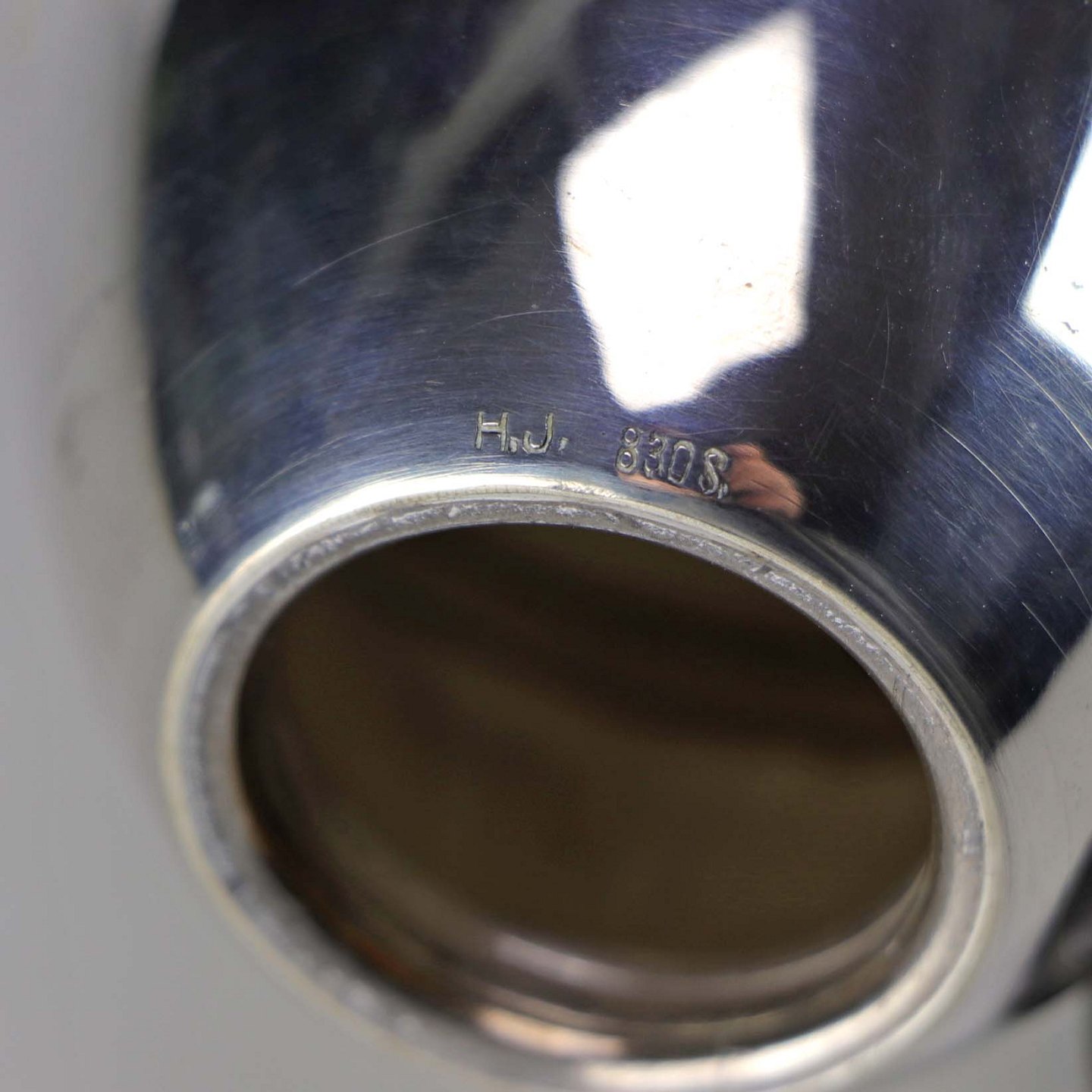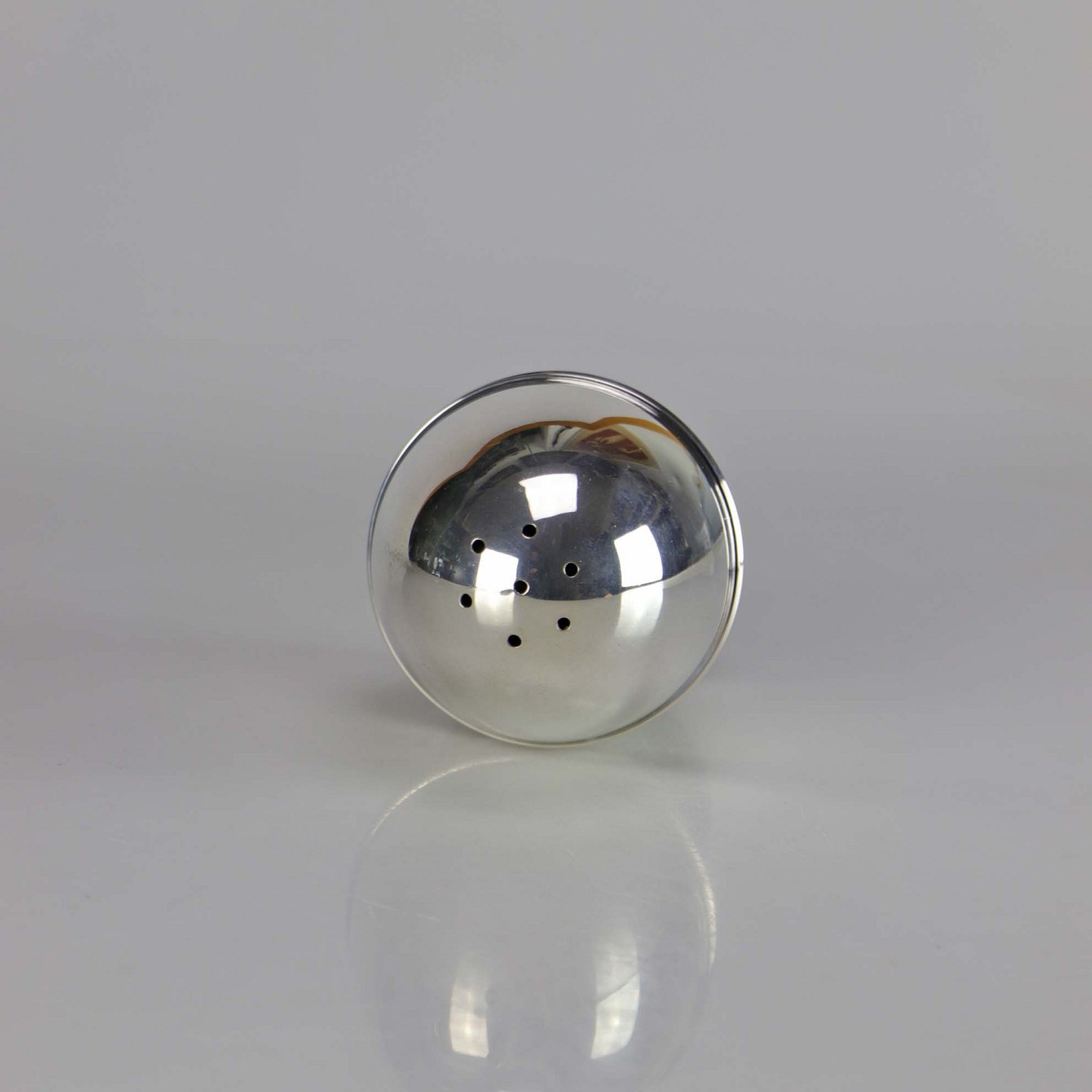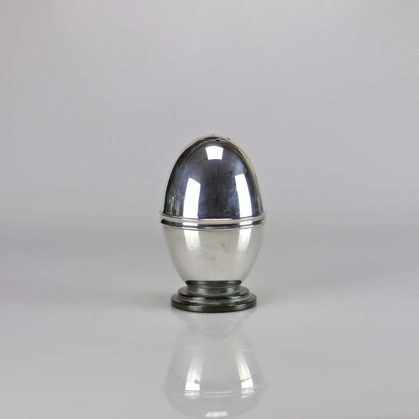 Sukkerstrø i sølv formet som et stående æg. Stemplet H.J 830s