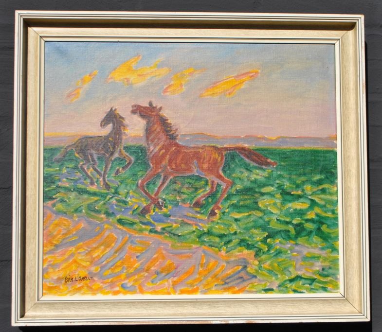 Larsen, Erik (1902 - 1975) Danmark: To frie heste på en eng. Olie på lærred. Signeret. 50 x 57 cm.