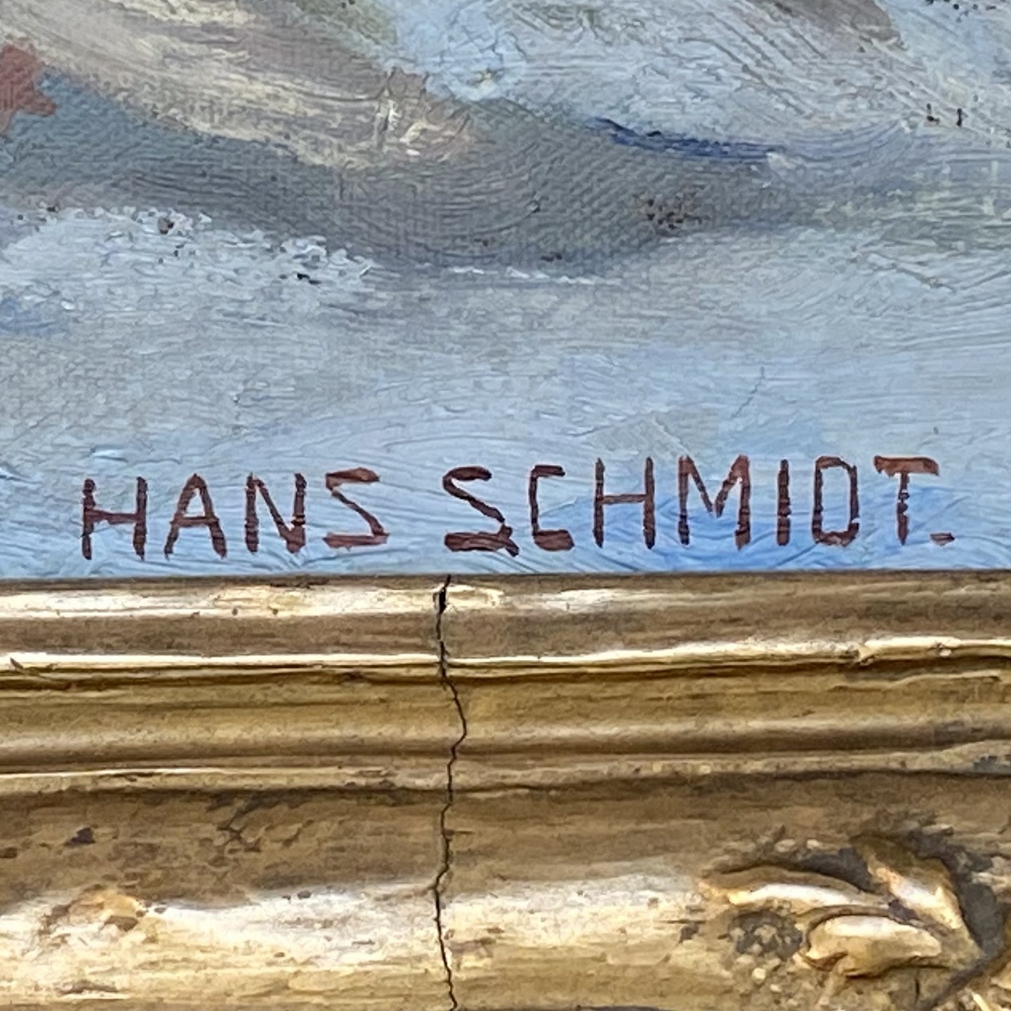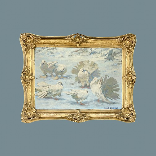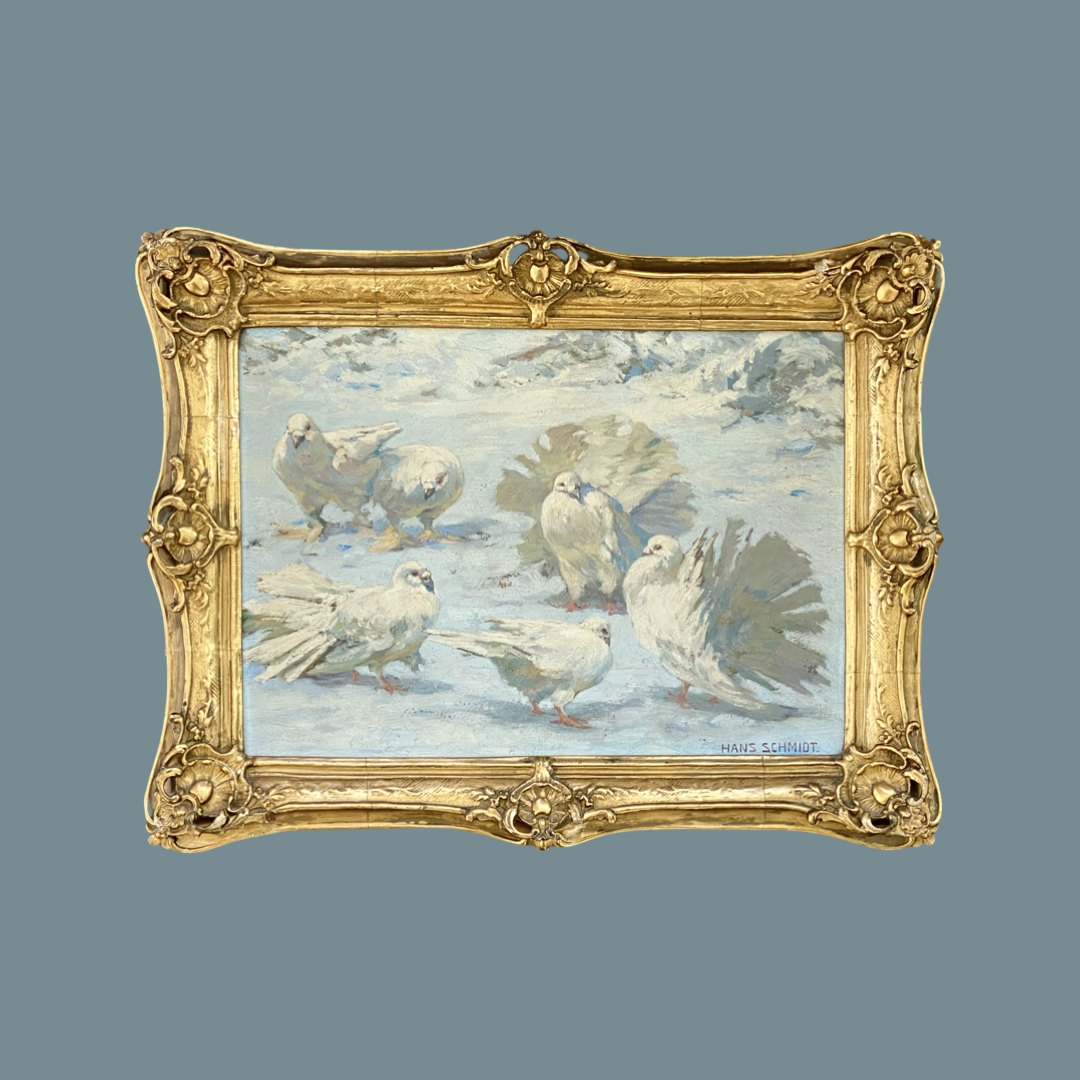 Hans Schmidt (1839-1917). Oil on canvas in gold frame. Motif with pigeons. The back with the designation of pigeons “German Rumblers”. Dimensions: 34 x 44 cm. (23.5 x 33.5 cm).