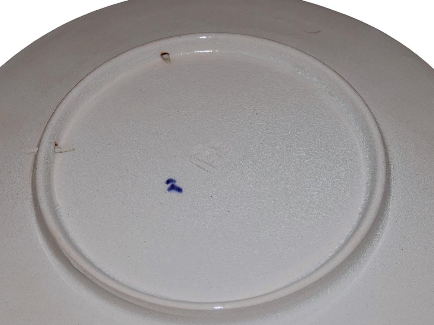Har "ALUMINIA" indpresset i glasuren på bagsiden.