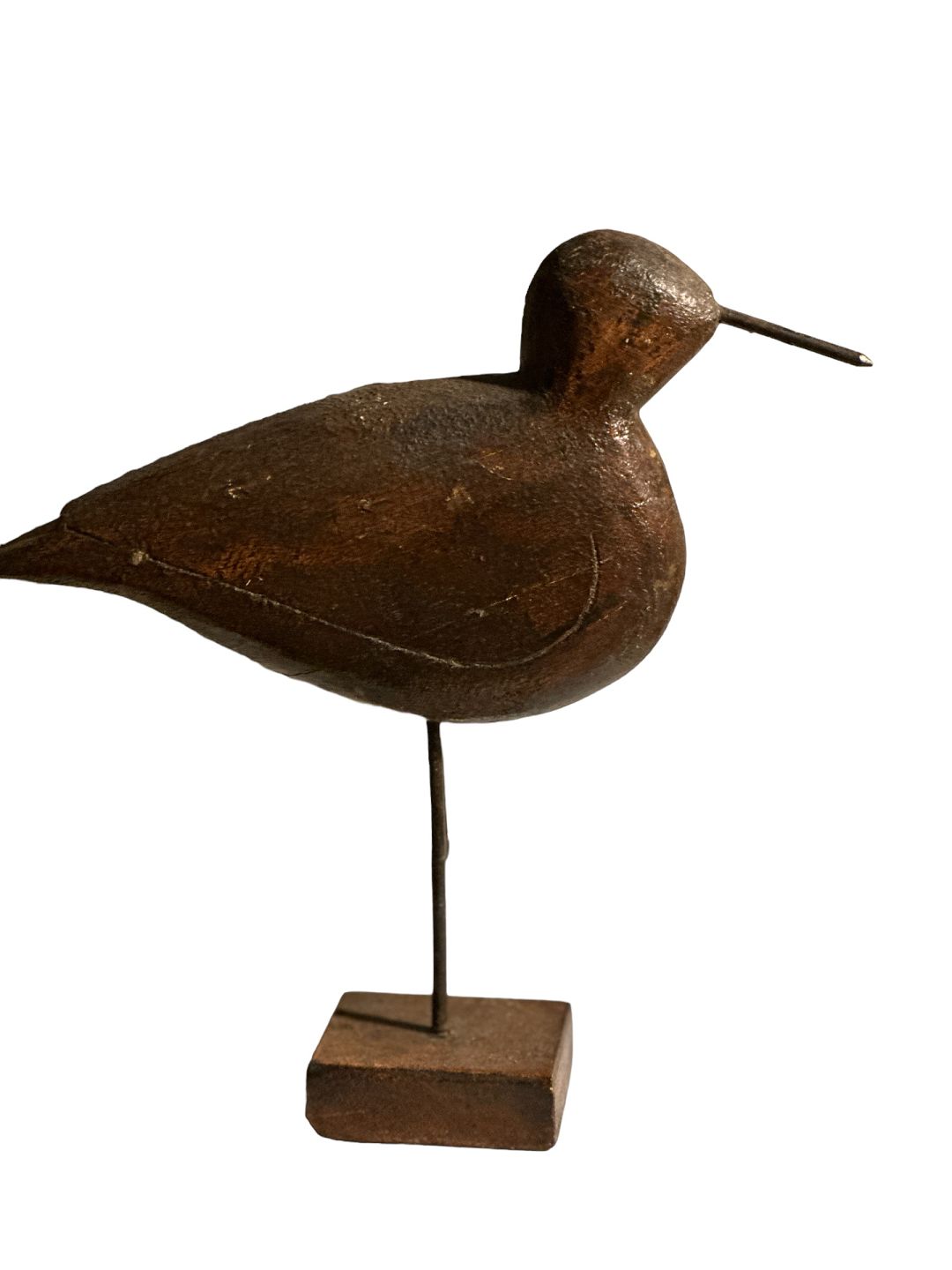 Skulpturel og dekorativ fugl udskåret af træ og stående på træfod.
