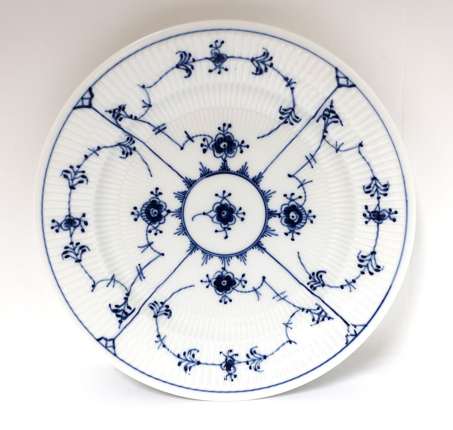 Royal Copenhagen. Musselmalet, riflet. Middagstallerken. Model 175. Diameter 25,5 cm. (2+3 sortering)