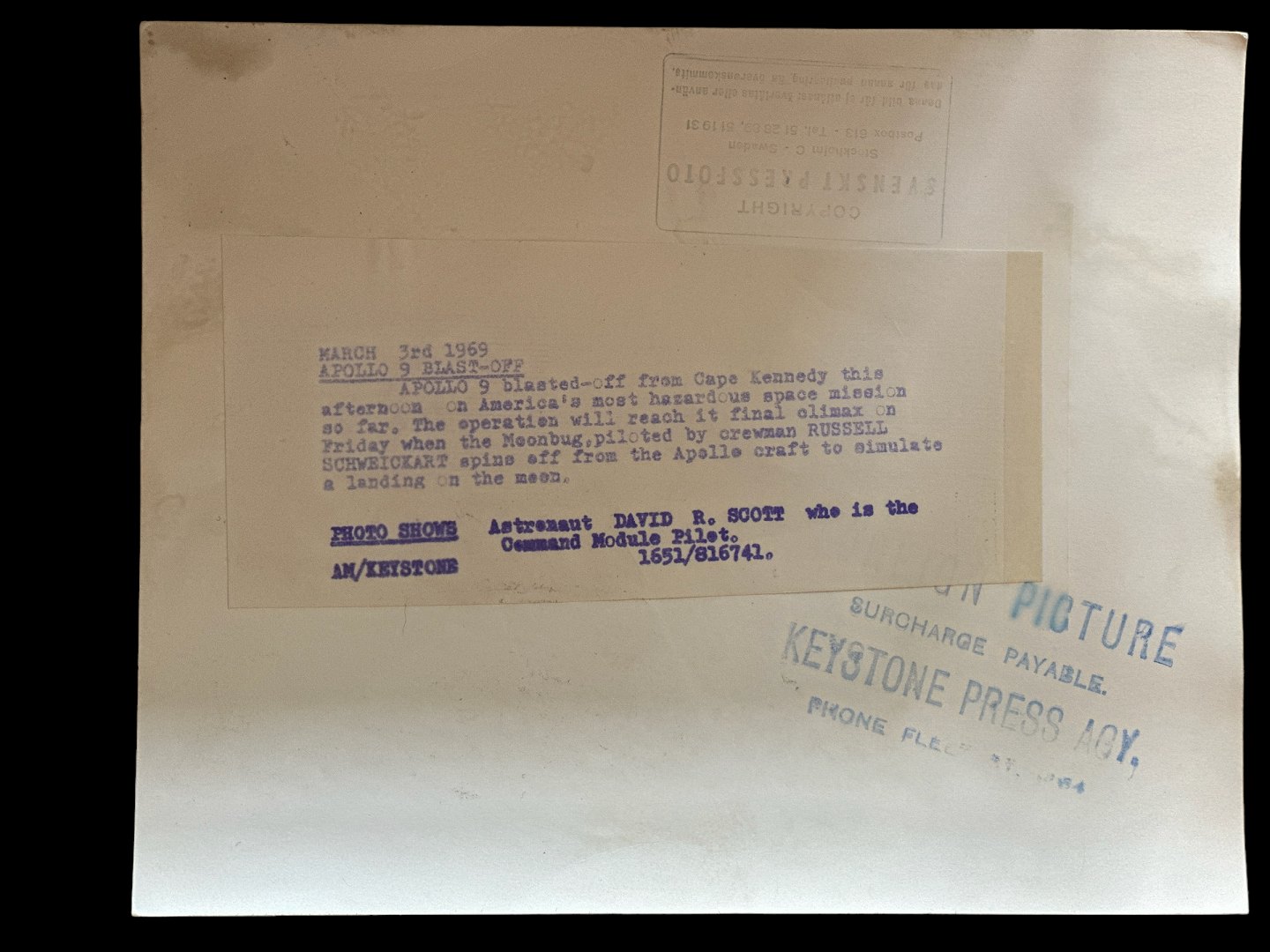 In addition to a stamp from the Keystone Press Agency, there is a copyright stamp from Svenskt Pressfoto in Stockholm.