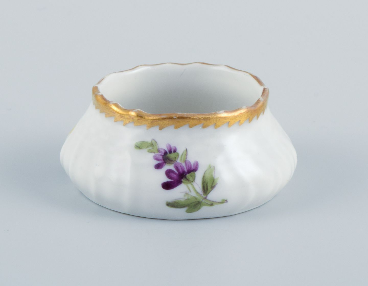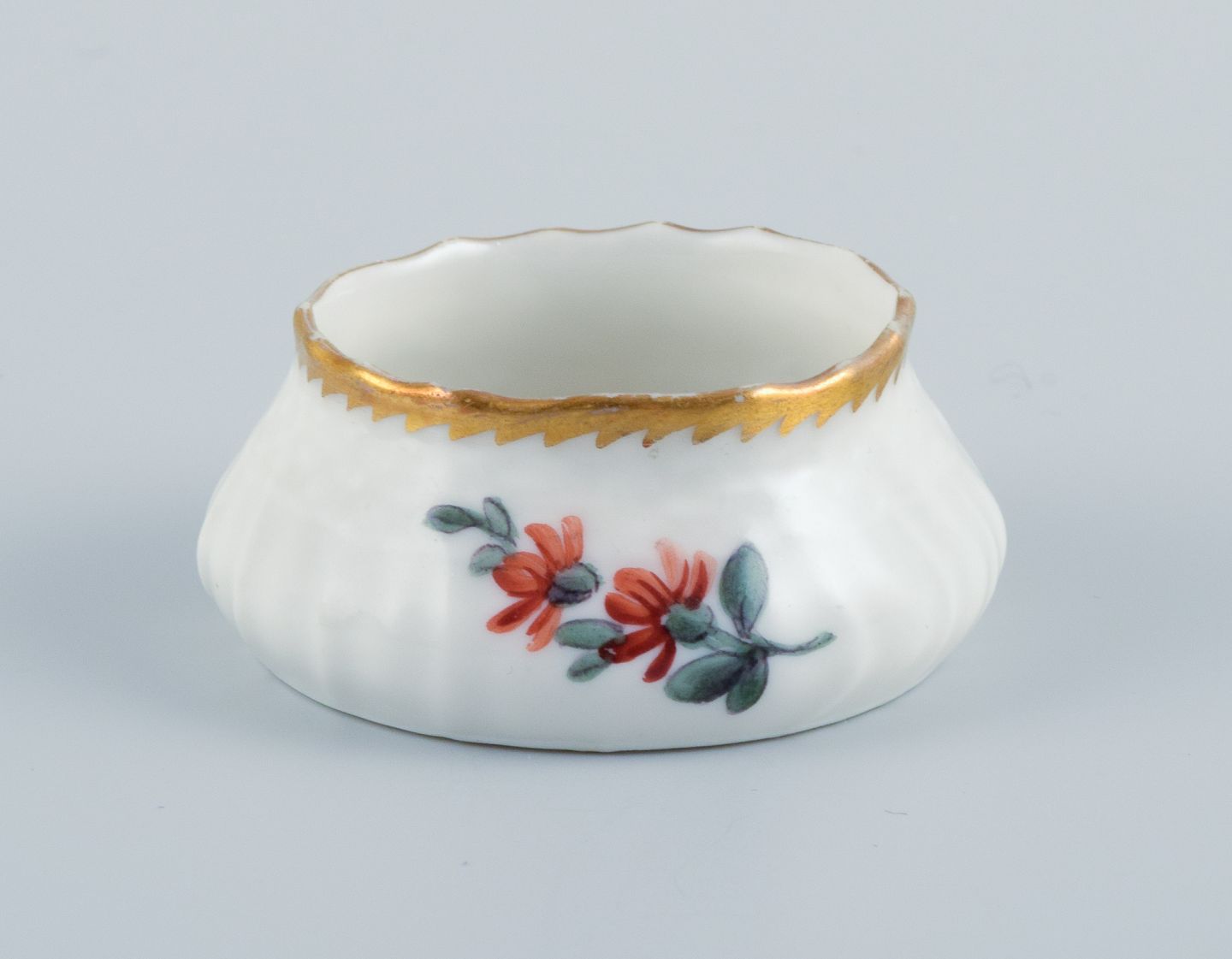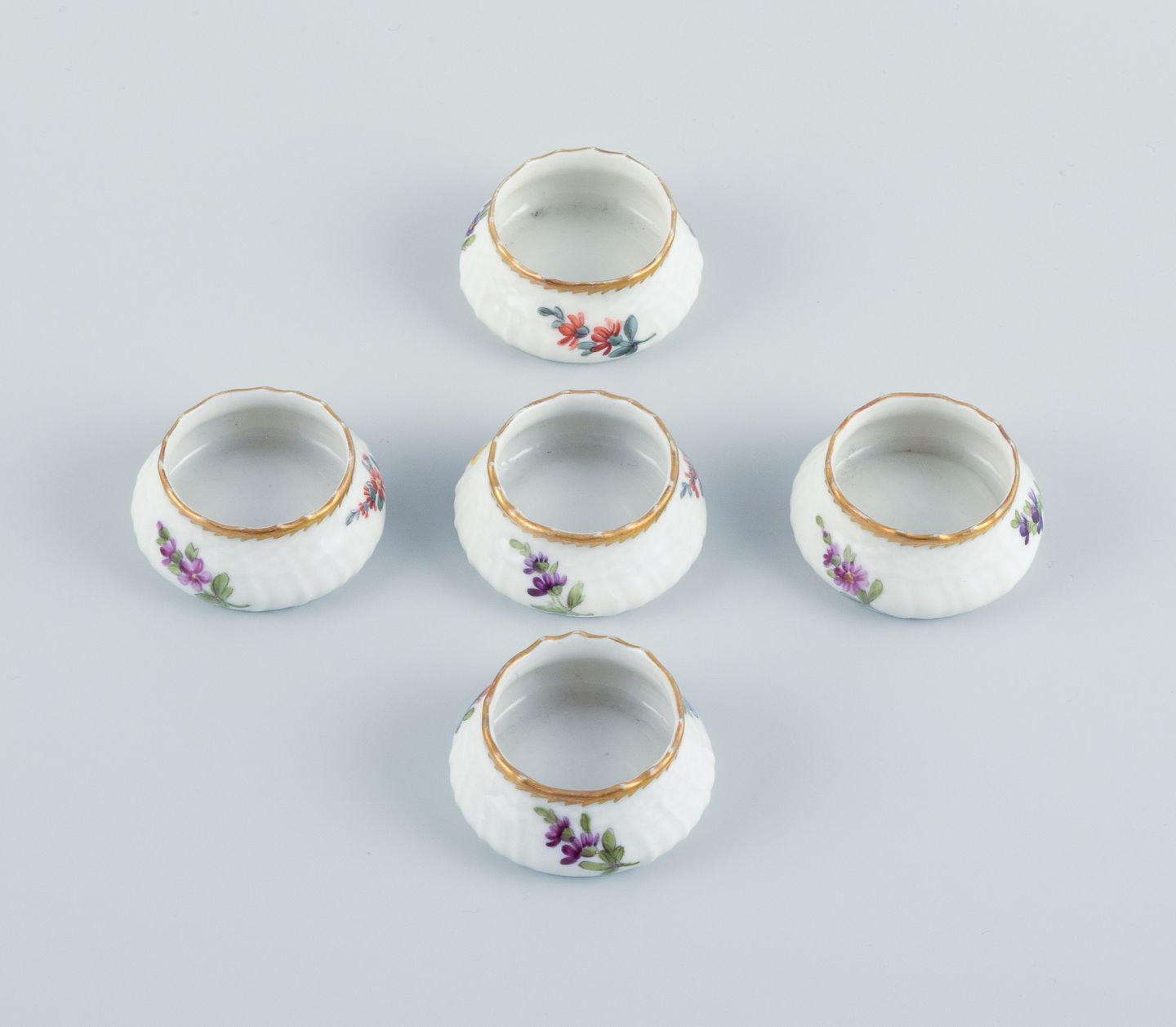 Et sæt på fem saltkar, håndmalet med blomster og takket guldkant.