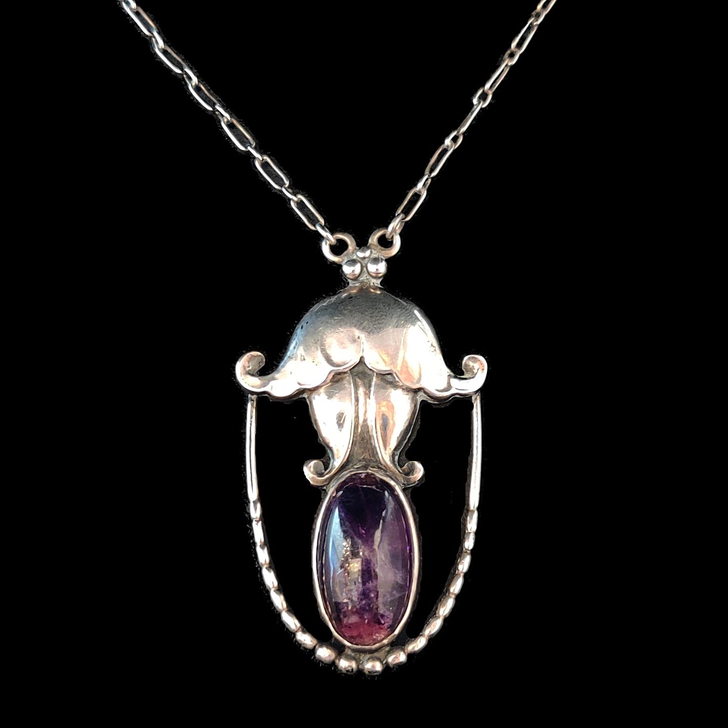 Vedhæng l. 5 cm. B. 2,9 cm. Der er en smule brugsspor på ametysten. Produceret hos Georg Jensen i Danmark, 1909 - 1914.