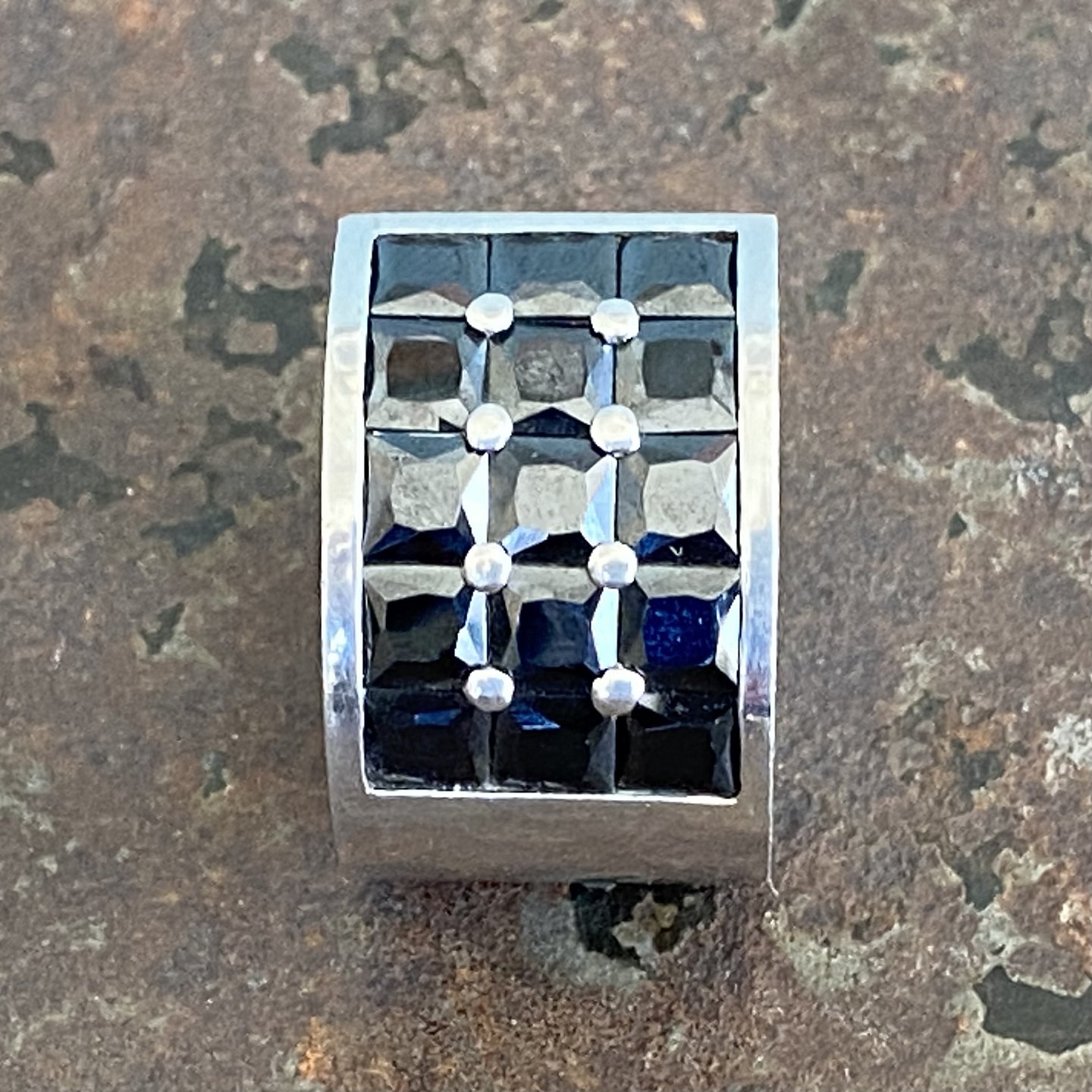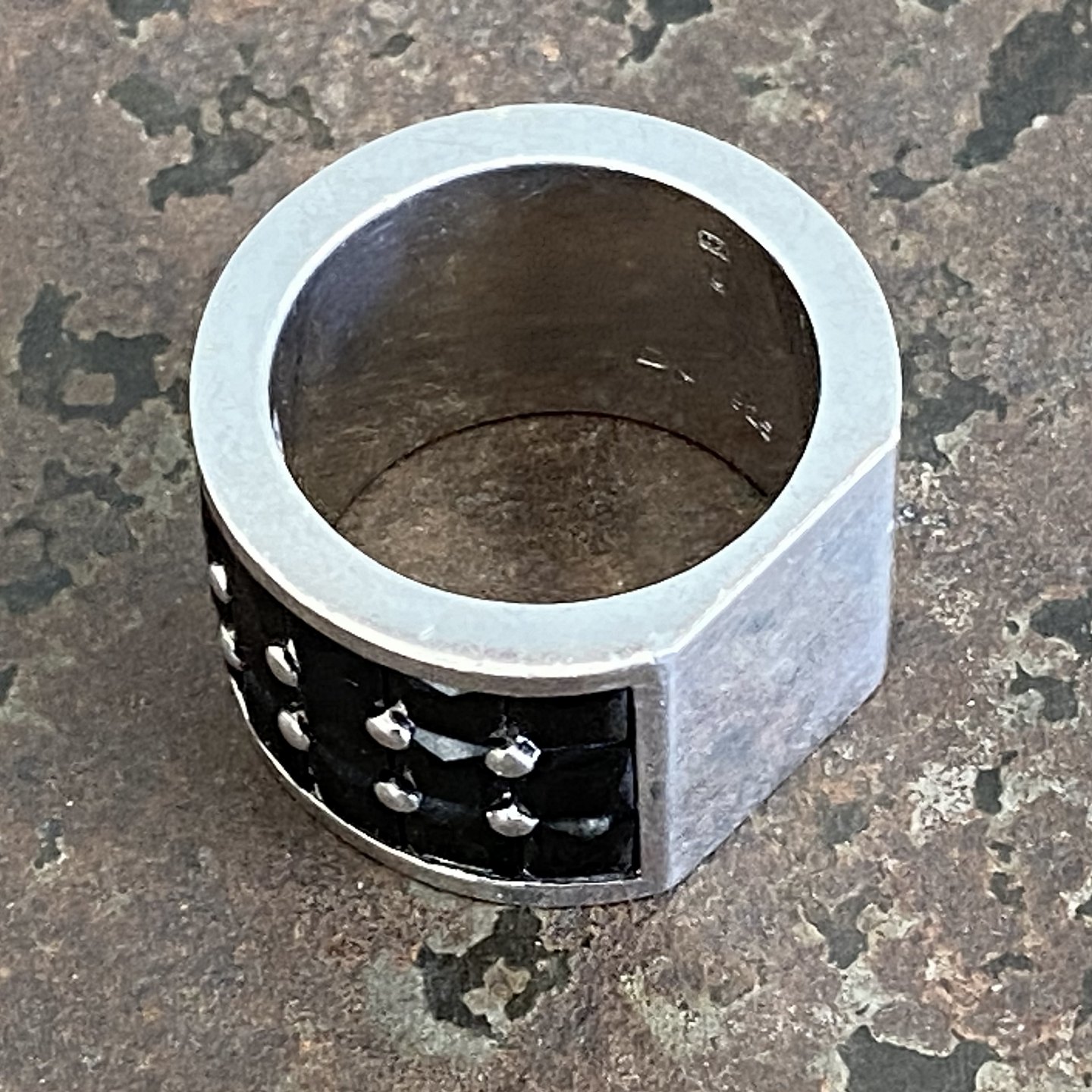 Stor bred ring af massivt sterlingsølv med sorte faceslebne cubic zirconia.