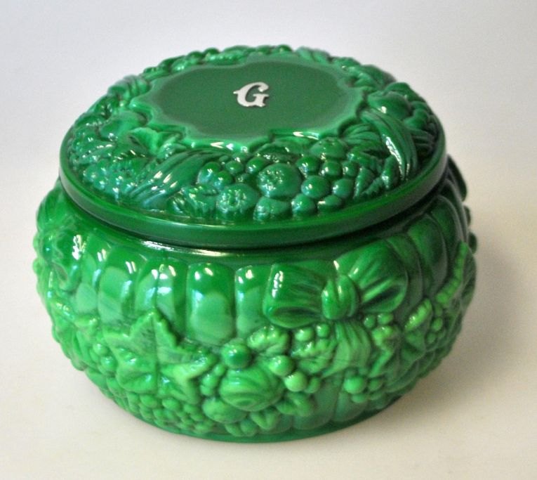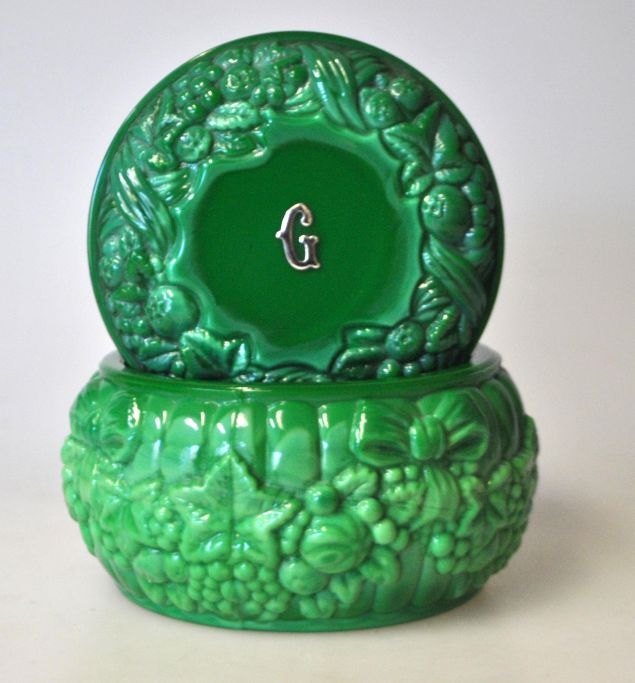 Rund skål med låg. Curt Schlevogt, Gablonz 1930'erne. Tyskland. Presset grøn glasmasse "malakit". Med insstøbt G på låg i sølv. Dekoreret i relief med blomster og ranker. Dia.: 9,5 cm. H.: 5 cm.