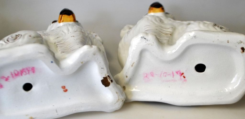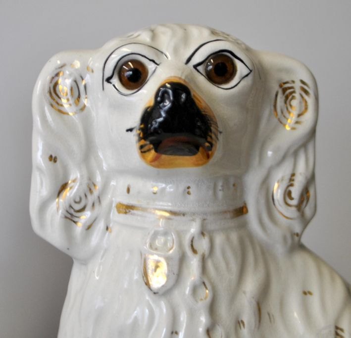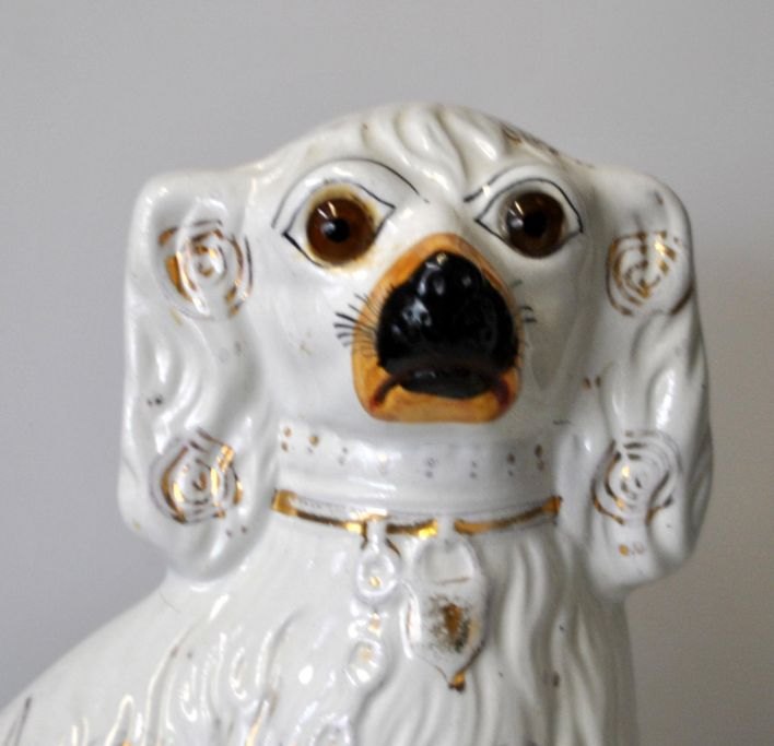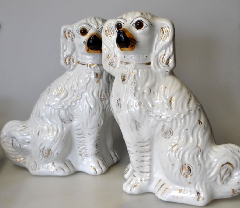 Et par sjældne Staffordshire hunde i fajance med glas øjne, 19. årh. Hvide med bemalinger og forgyldninger. H: 24 cm. B: 20 cm.