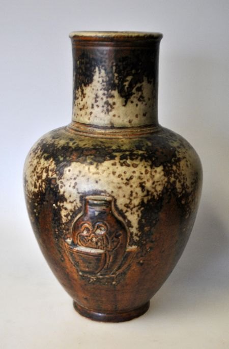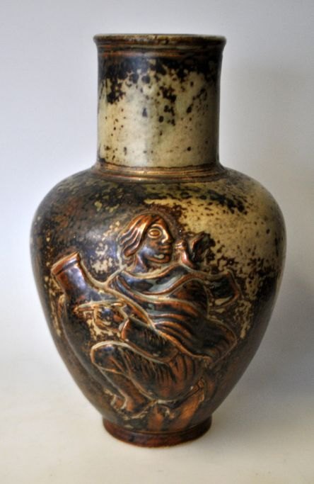 Royal Copenhagen vase med relief, no. 20247, Design: Jais Nielsen, Jais (1885 - 1961). Reliefdekoration med pottemager. Sung glasur. H.: 24 cm.