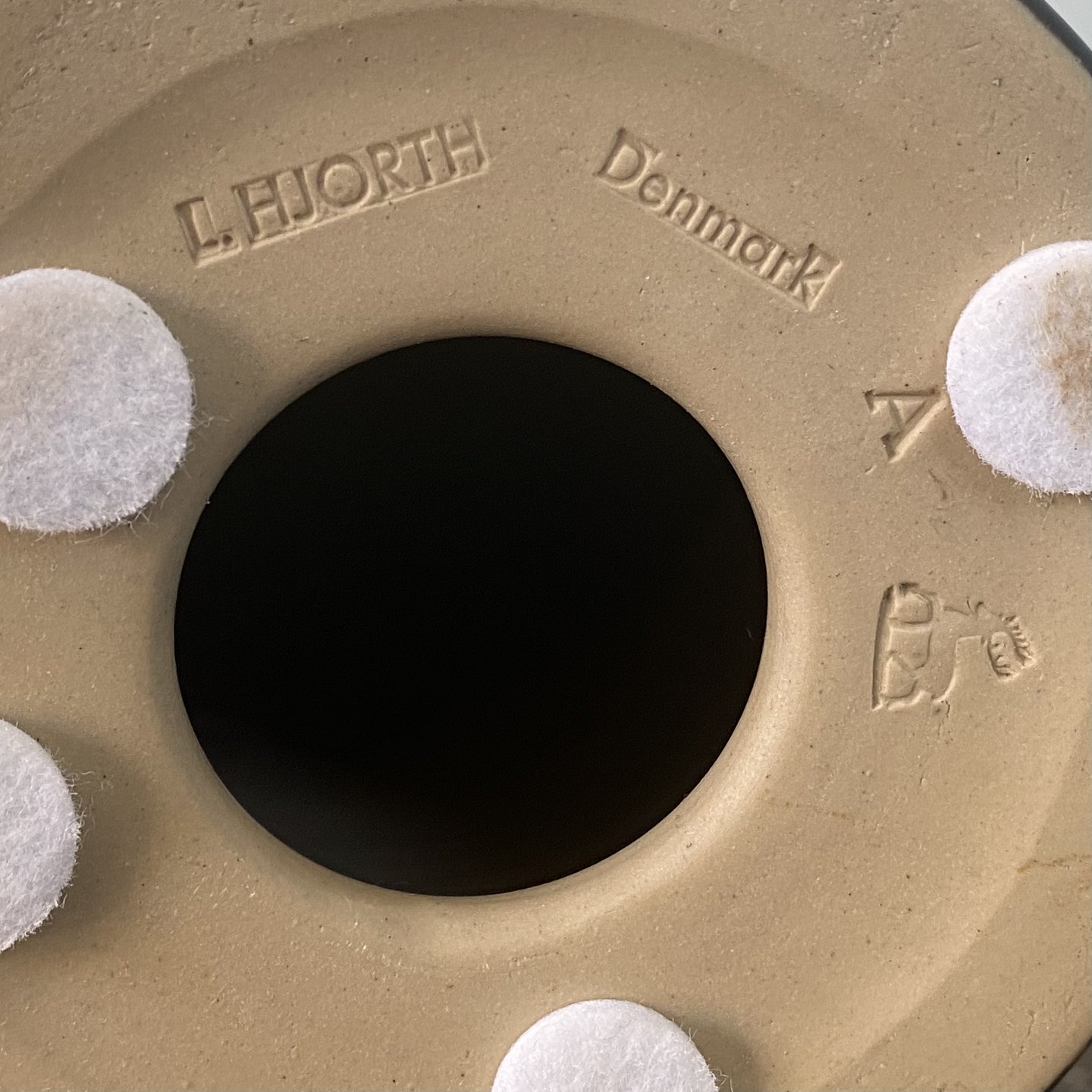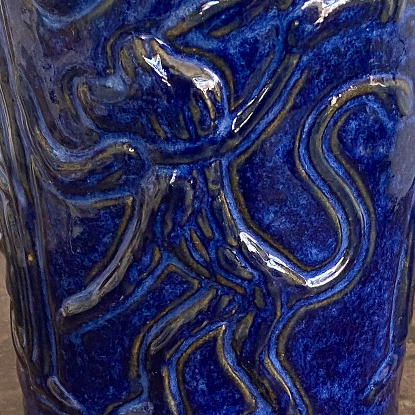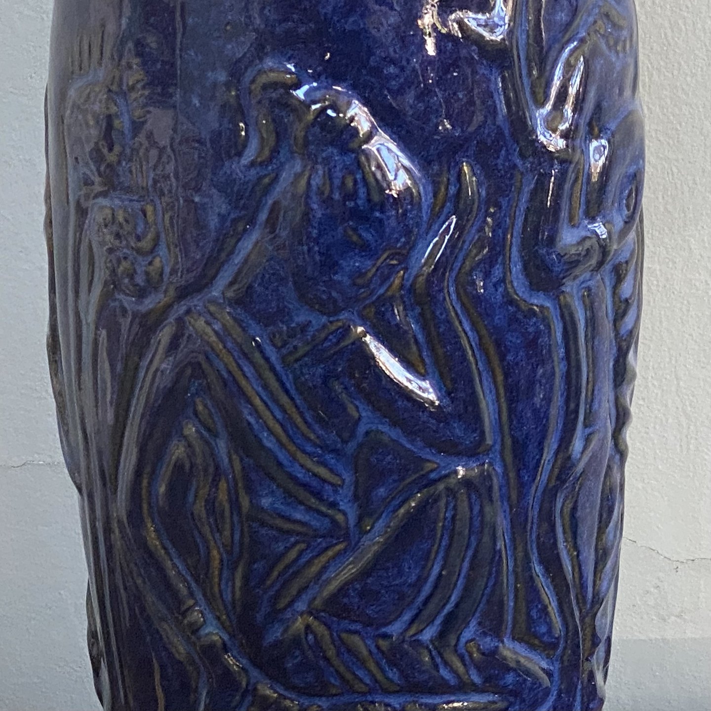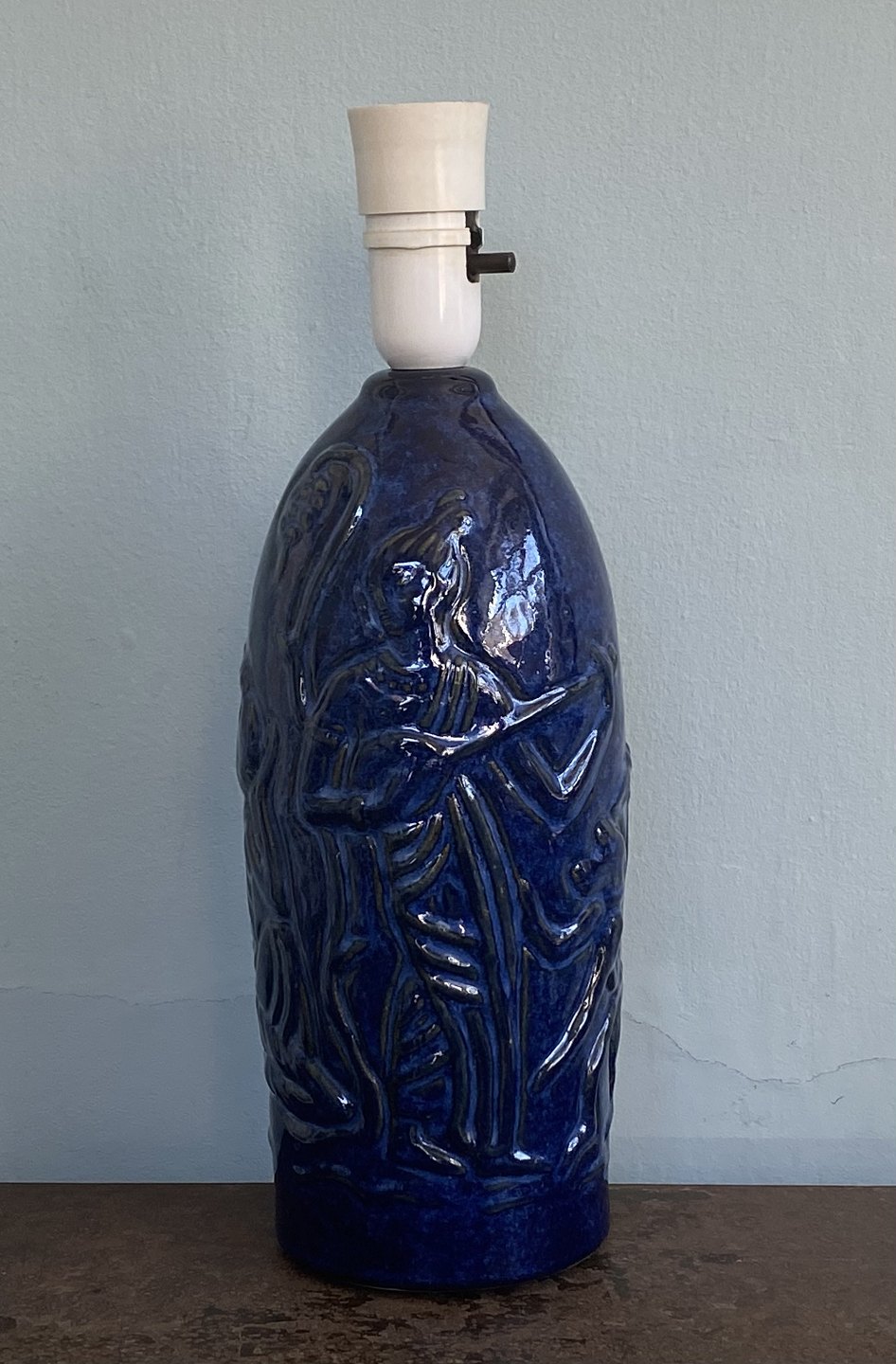 L. Hjorth lampefod af blåglaseret keramik dekoreret med figurer i relief. Perfekt stand.