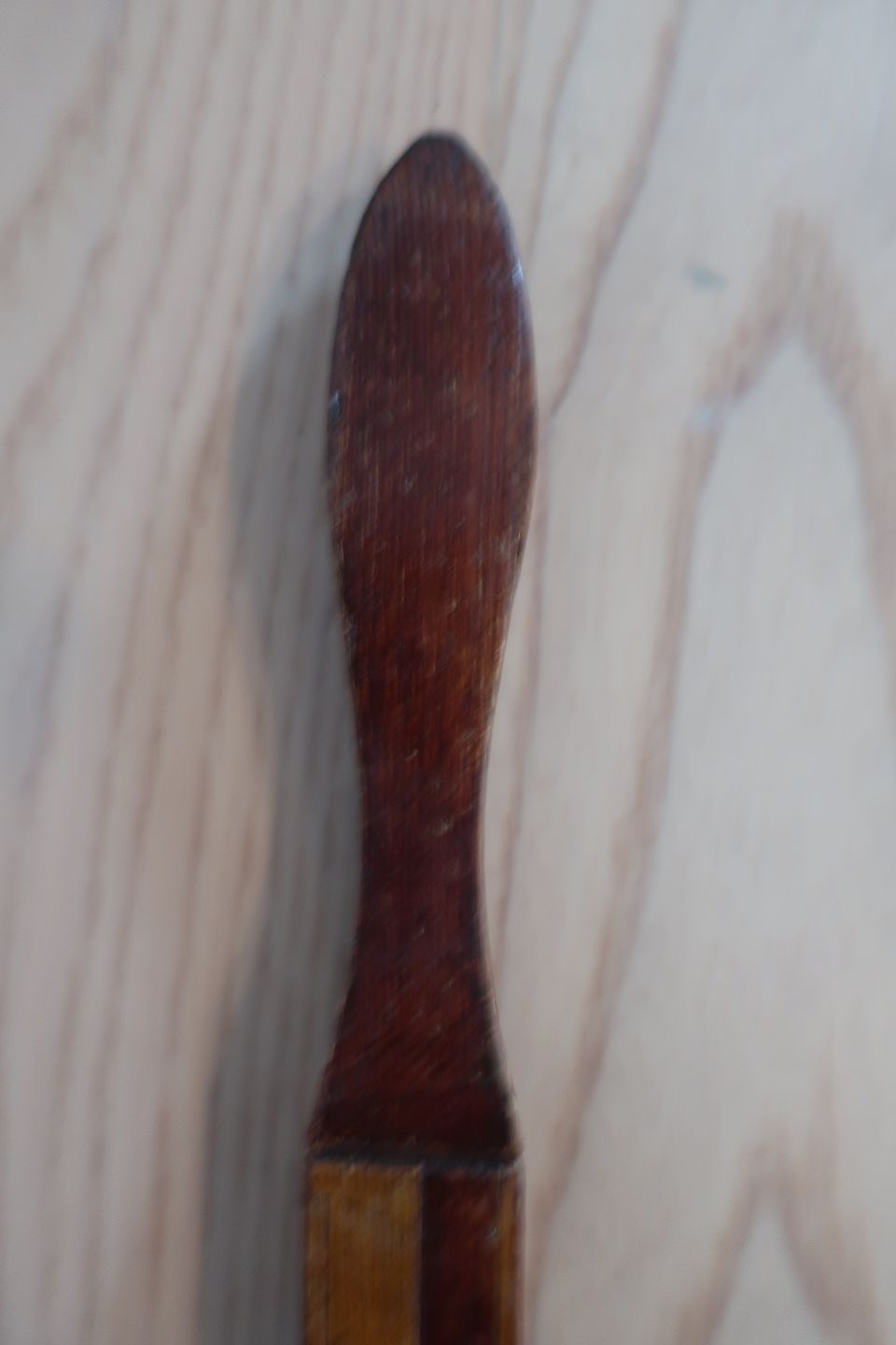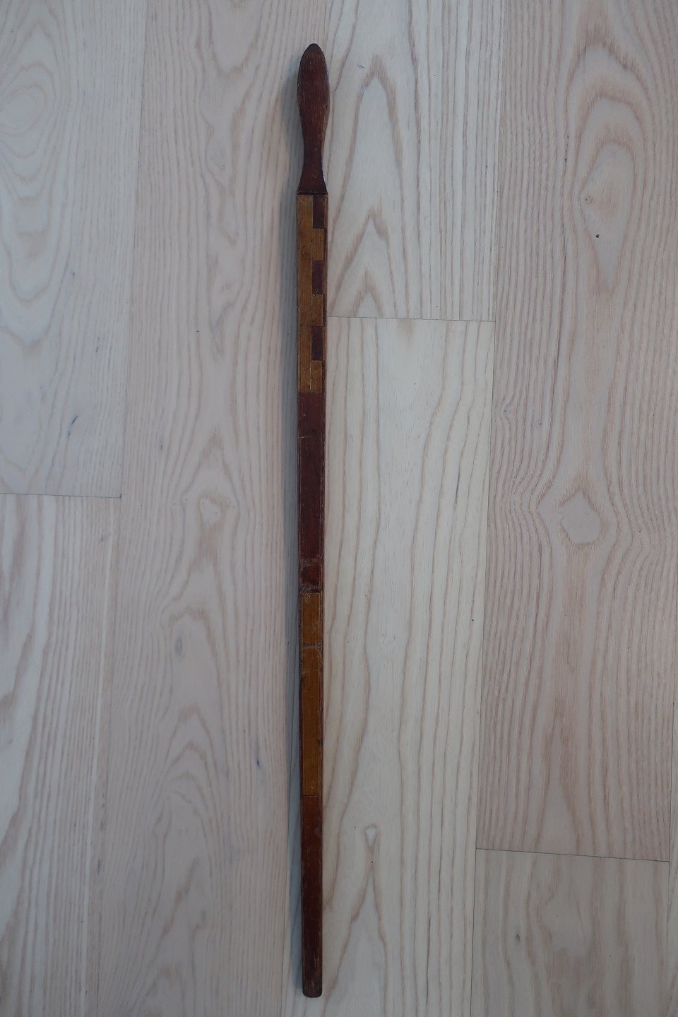 Smukt udført i træ med nøjagtig bemaling, som om det er intarsia, og meget dekorativt håndtag