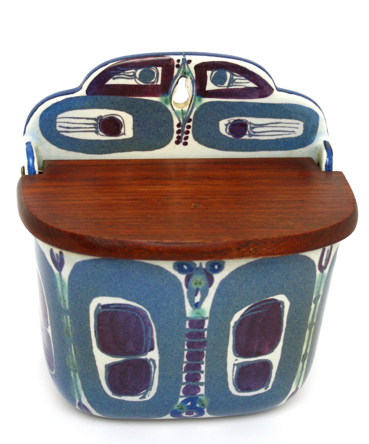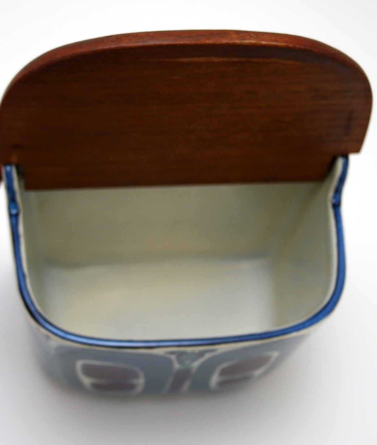 Aluminia, Tenera, Saltkar med teaktrælåg. Designet af Inge-Lise Koefoed i 1961. Nr. 180/261. Højde 16 cm. Længde 15 cm. Dybde 10 cm. Flot stand med lettere overfladekrakelering. Pris: 425 kr.