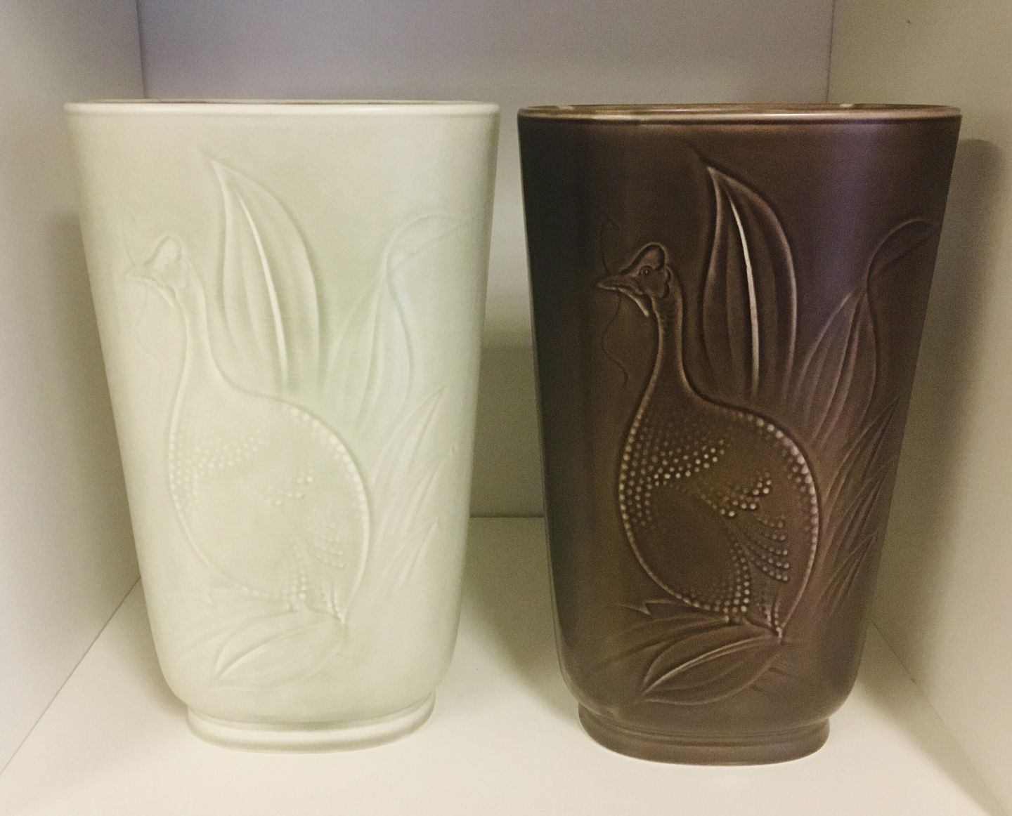 Aluminia Kunstfajance, 2 stk. vaser i Solbjergserien, 22 cm høje, nr. 1712, designet af Nils Thorson 1935