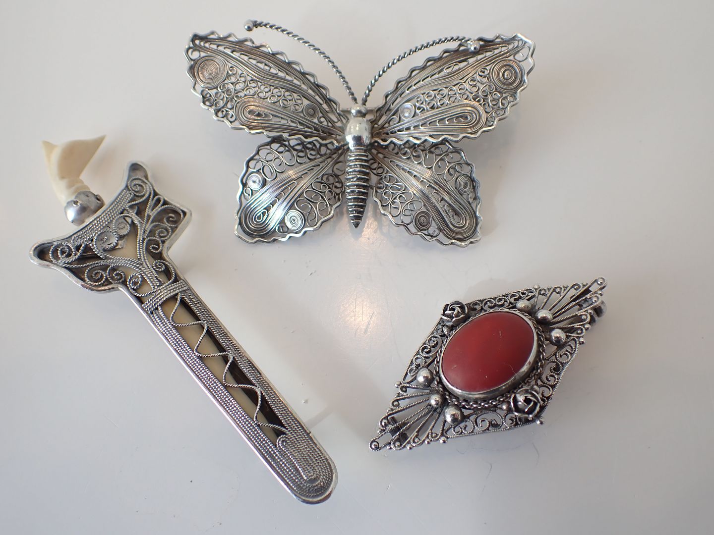 Text available in Danish: 3 filegranbrocher i sølv - Sværdbroche, sommerfuglebroche og koralbroche. Sælges individuelt. Sommerfugl er solgt.