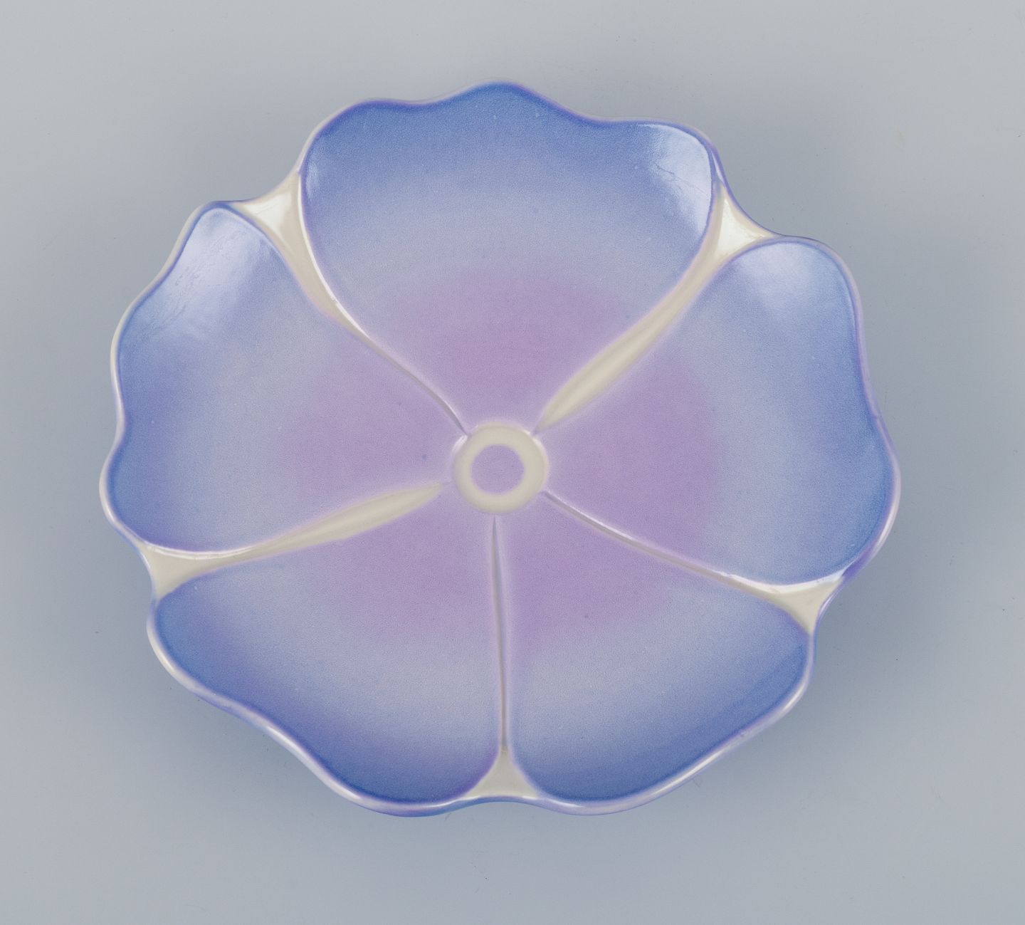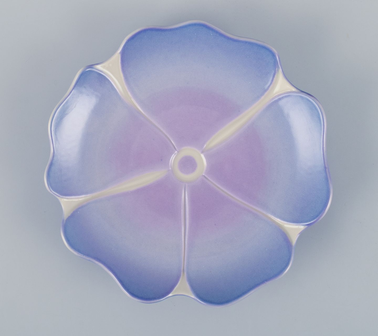 Margareta Hennix for Gustavsberg Studiohand, Sweden, unique ceramic bowl in Art Nouveau style shaped like a flower. Glazed in shades of purple.