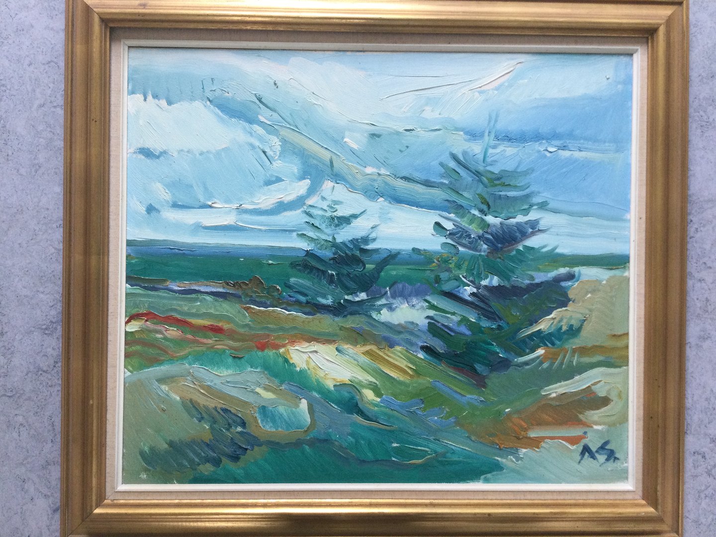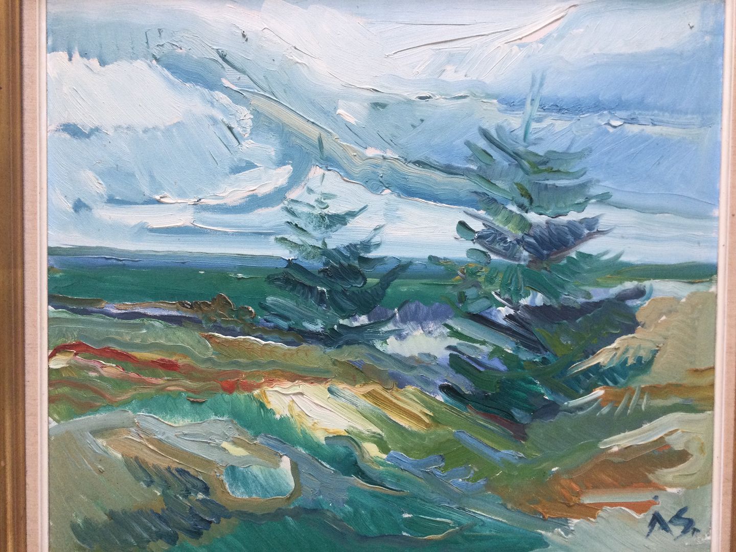 Maleri af Aage Strand - Klitter og graner ved Havet.