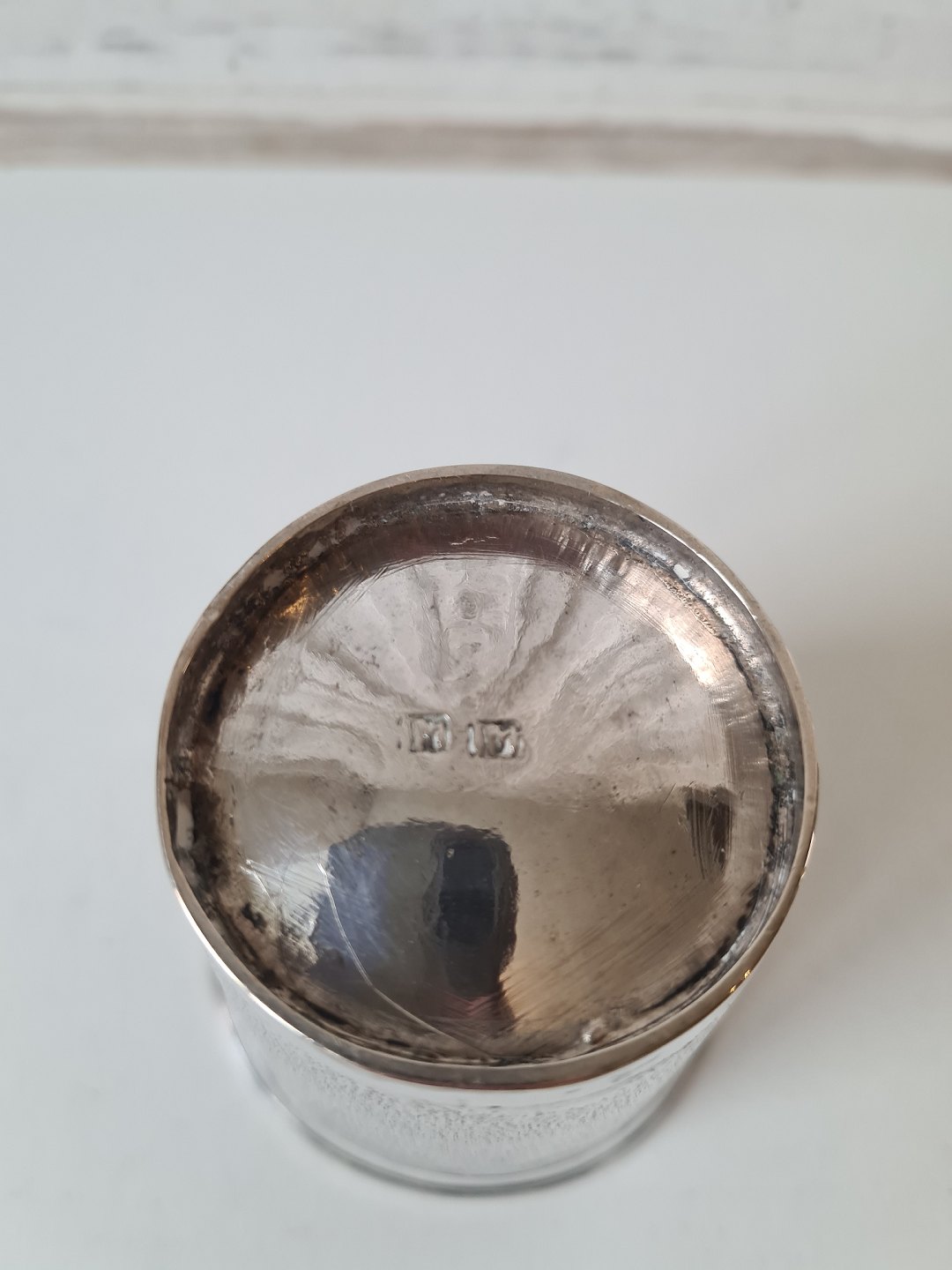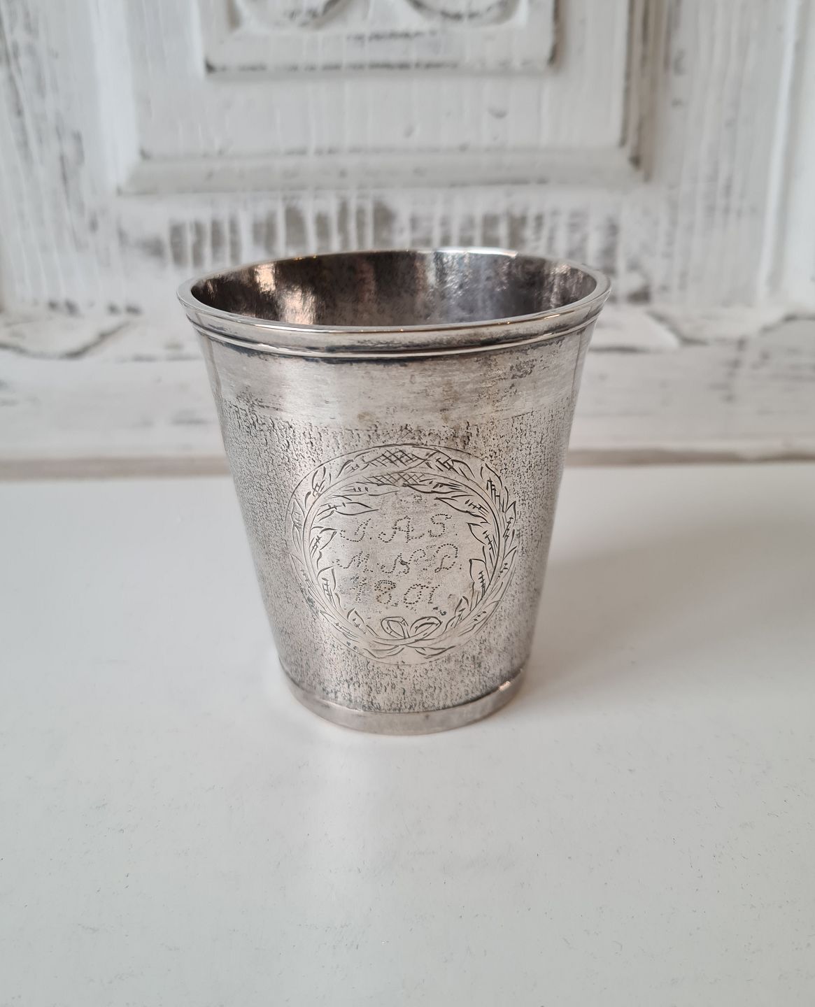 Nålepunslet sølvbæger forsynet med ejerinitialer samt årstal 1807