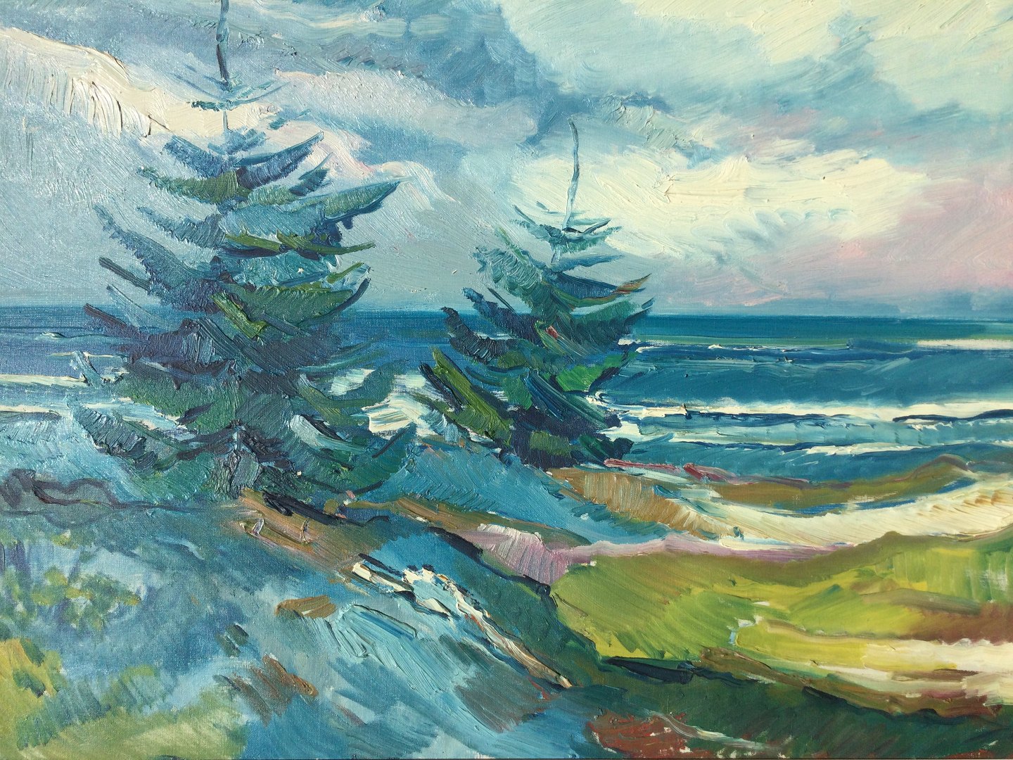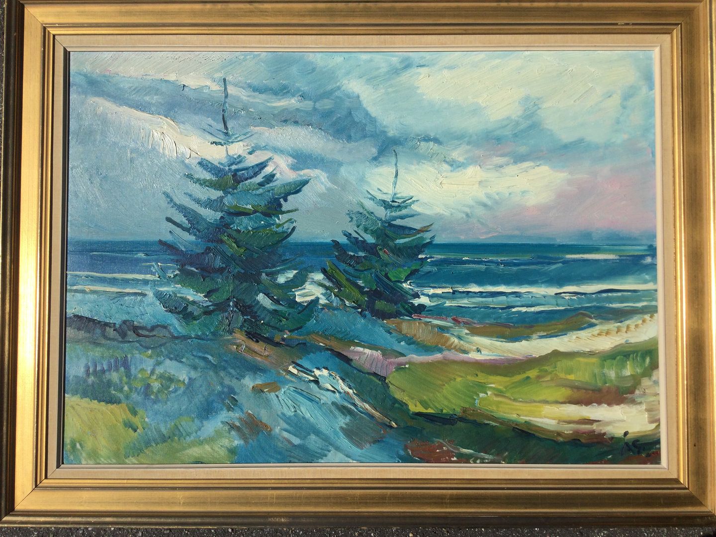 Maleri af Aage Strand - Klitter og graner ved Havet.