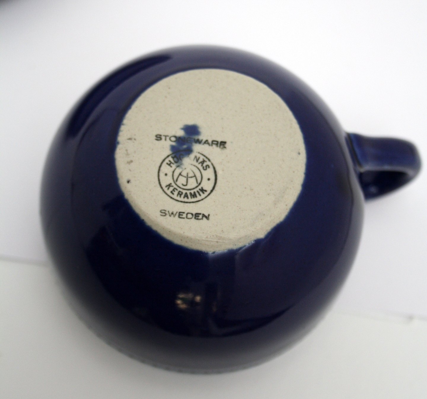 Text available in Danish: Höganes/Høganes, Sweden, Old Höganes, Stor tekop i koboltblå glasur. Højde 8 cm. Øverste diameter 9 cm. Underkop diameter 16 cm. Pris: 125 kr. stk. Lager: 6