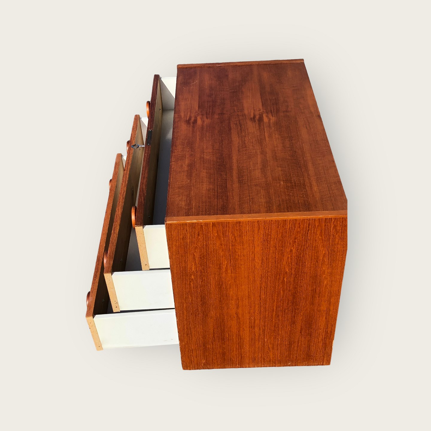 Chest of drawers in teak veneer from the 1970s. Some age-related traces of use. Dimensions HxWxD: 52x76x40 cm