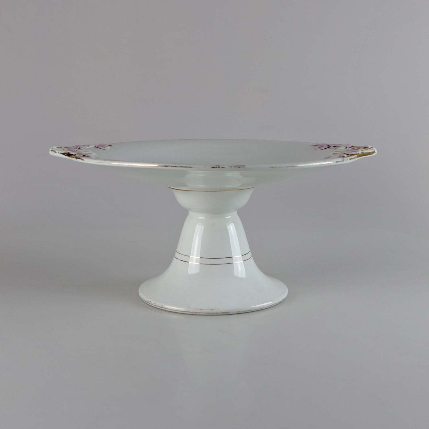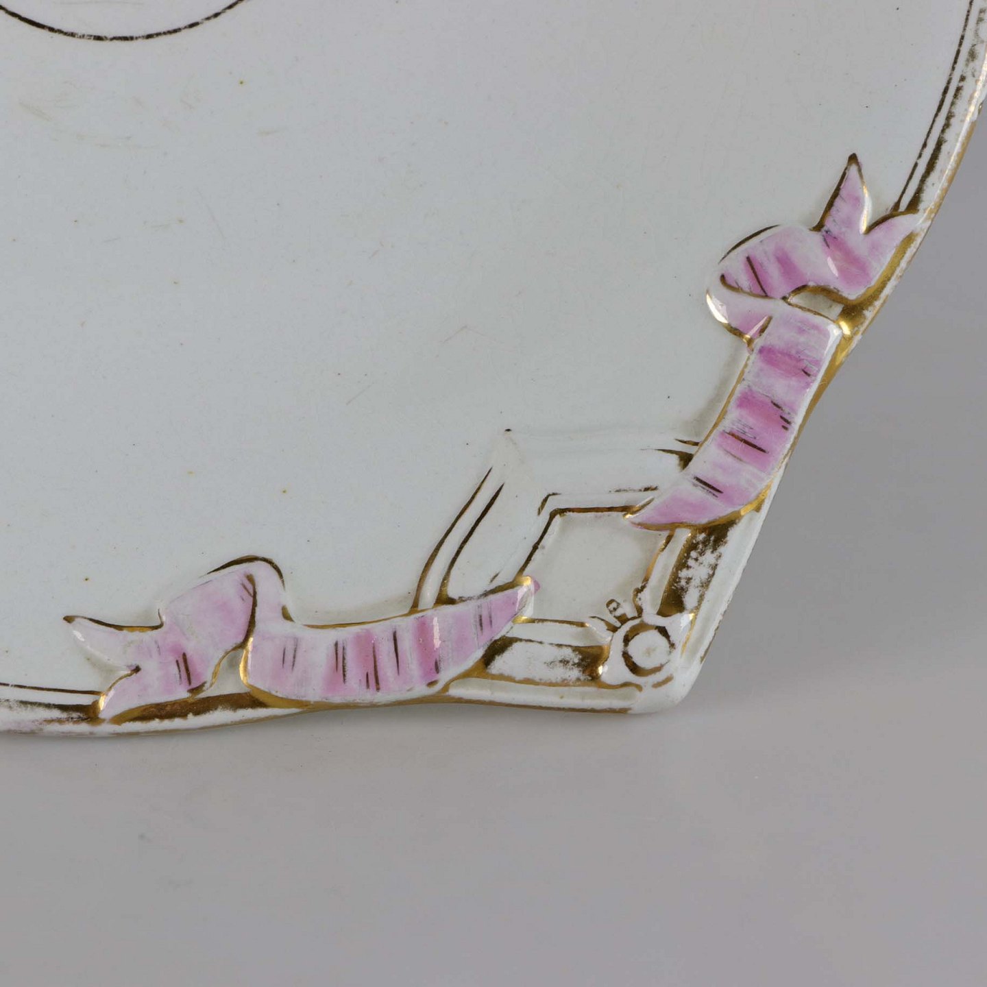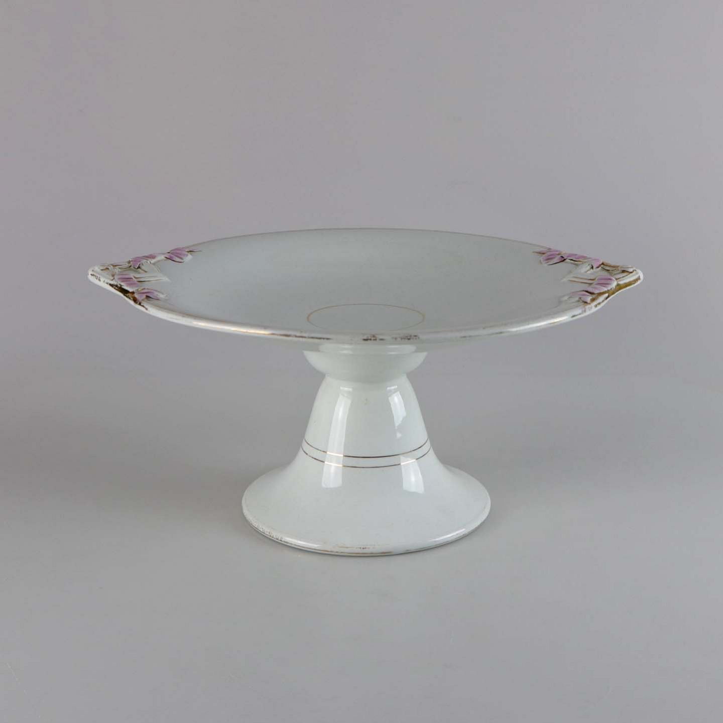 Antikt fad på fod i fajance med lyserøde bånd og guldkant dateret før år 1888