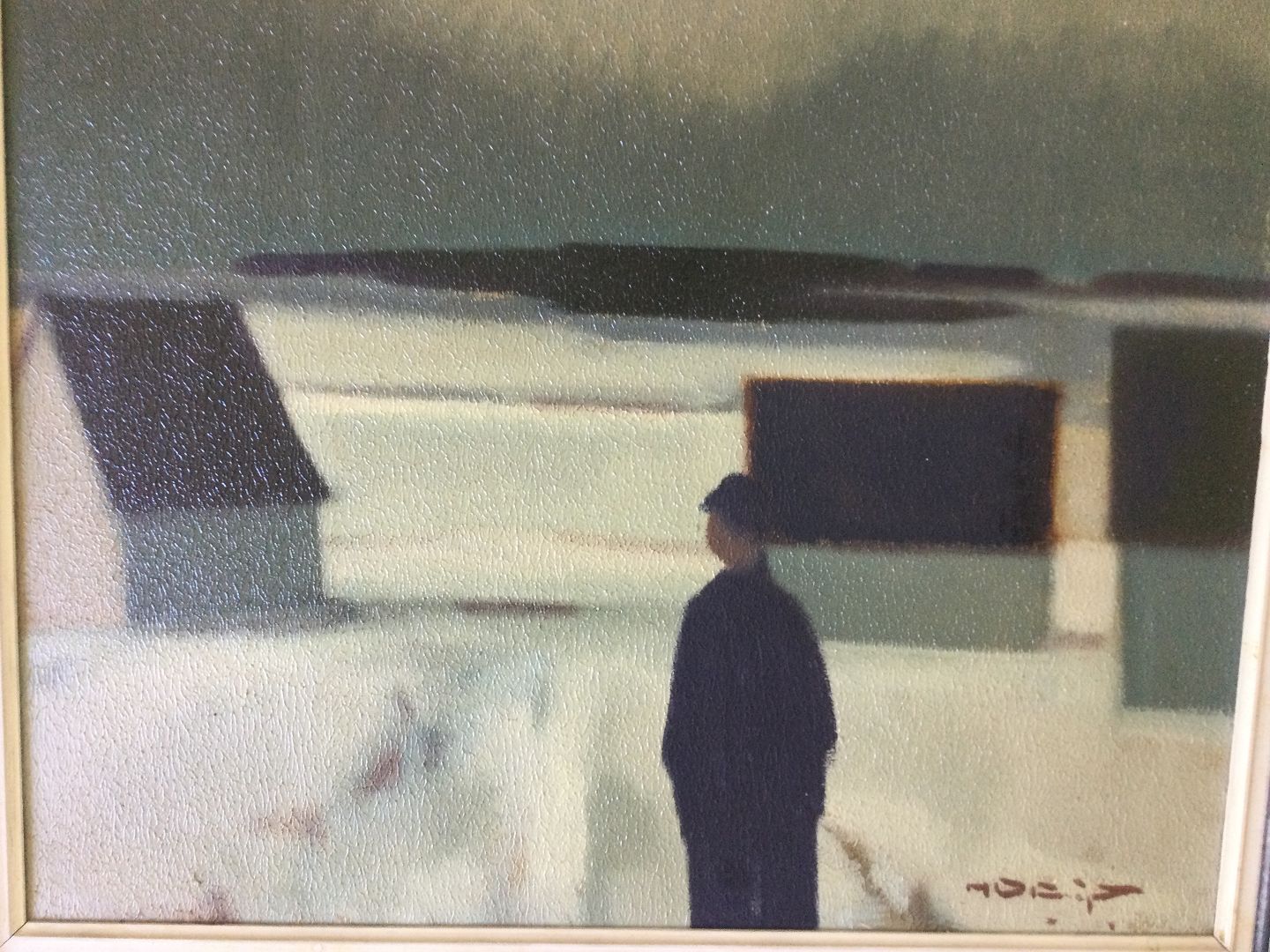 Maleri af Knud Horup - Vinterparti med person og huse.