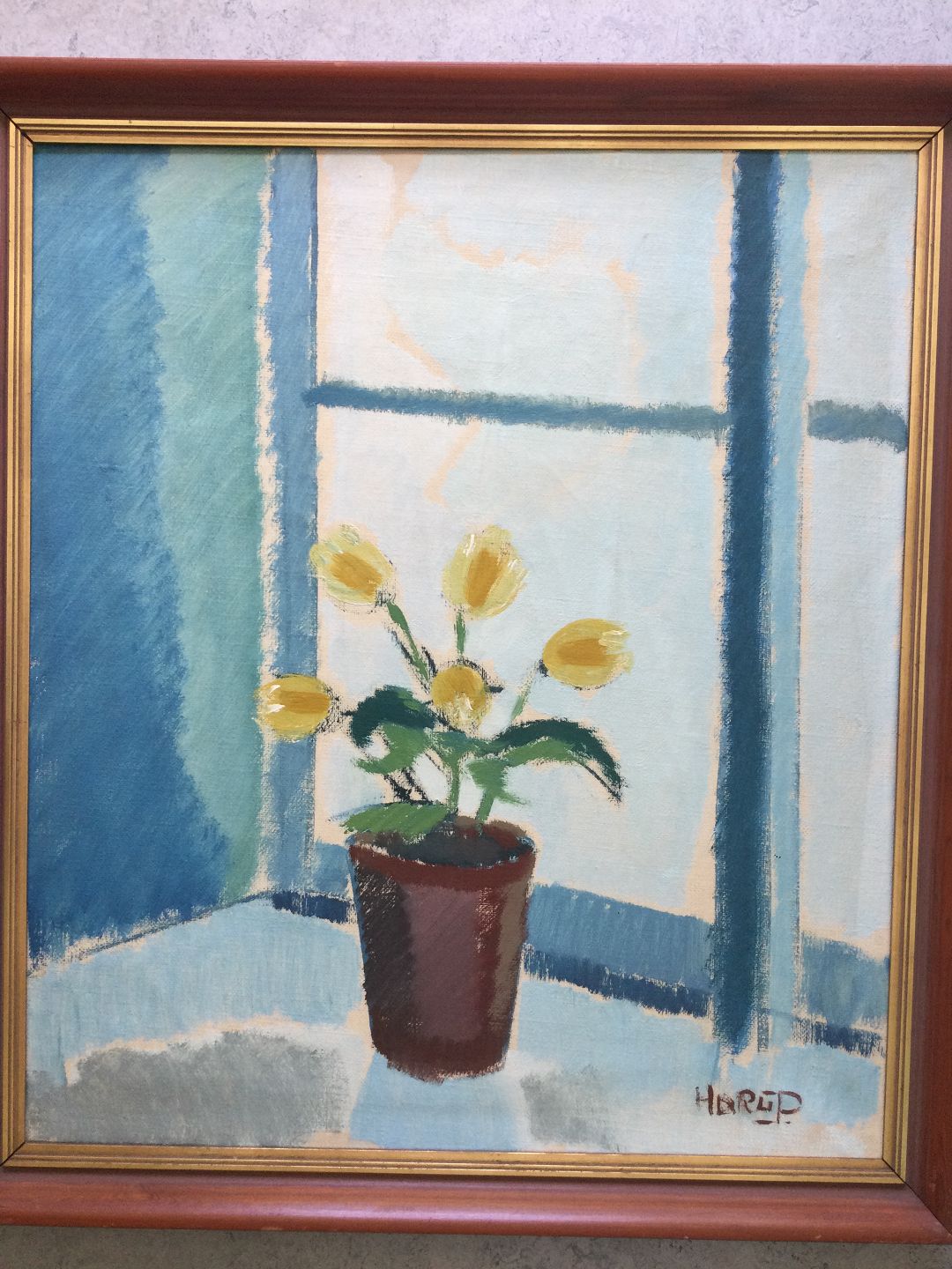 Maleri af Knud Horup - Opstilling i vindue med gul potteplante.