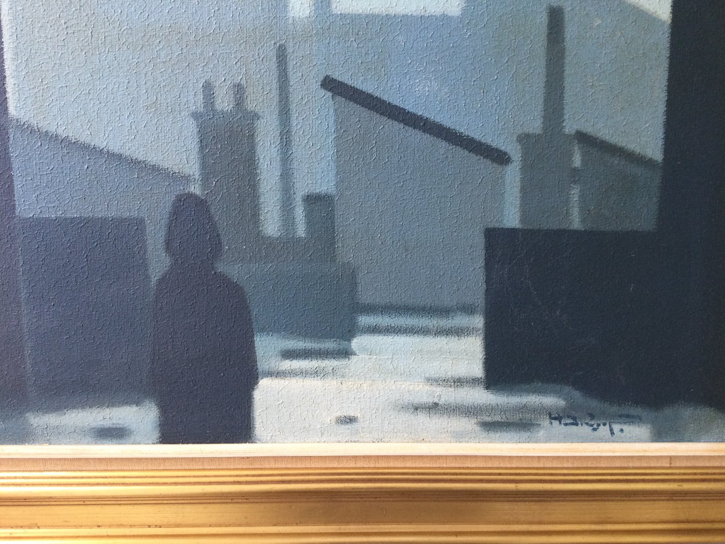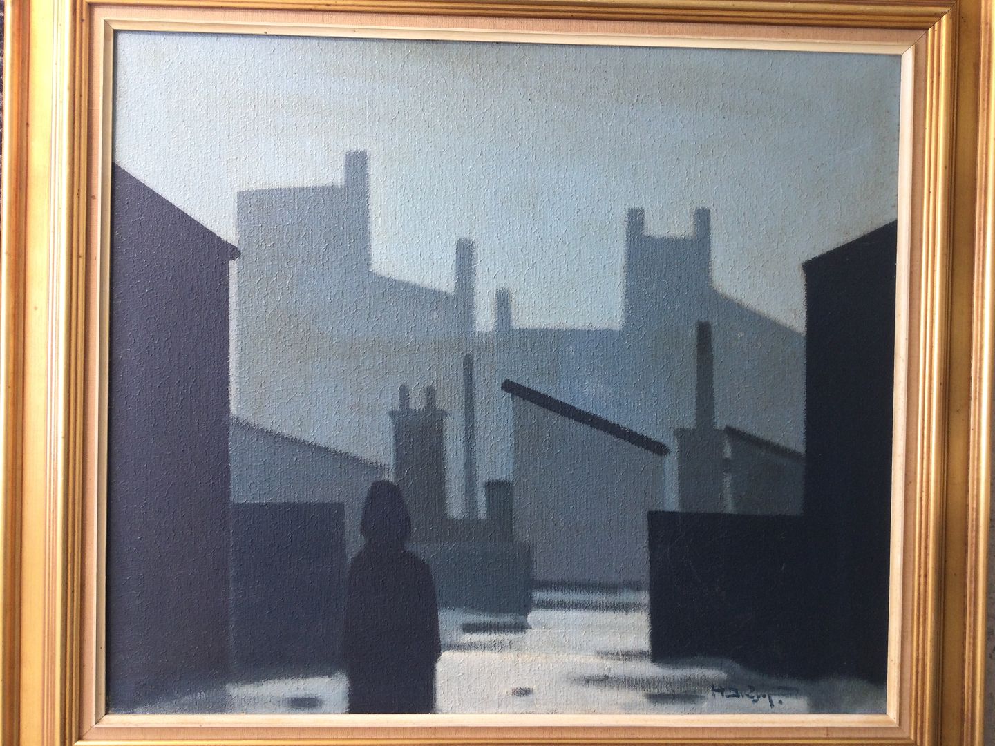 Maleri af Knud Horup - Industrikvarter med bygninger og person.