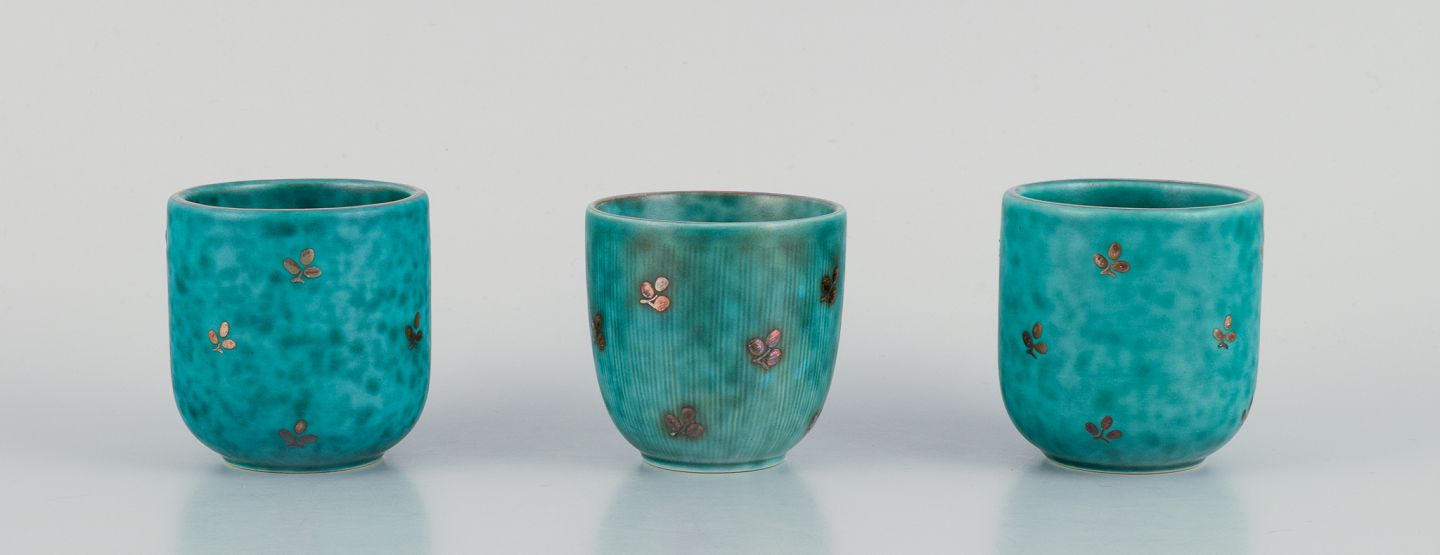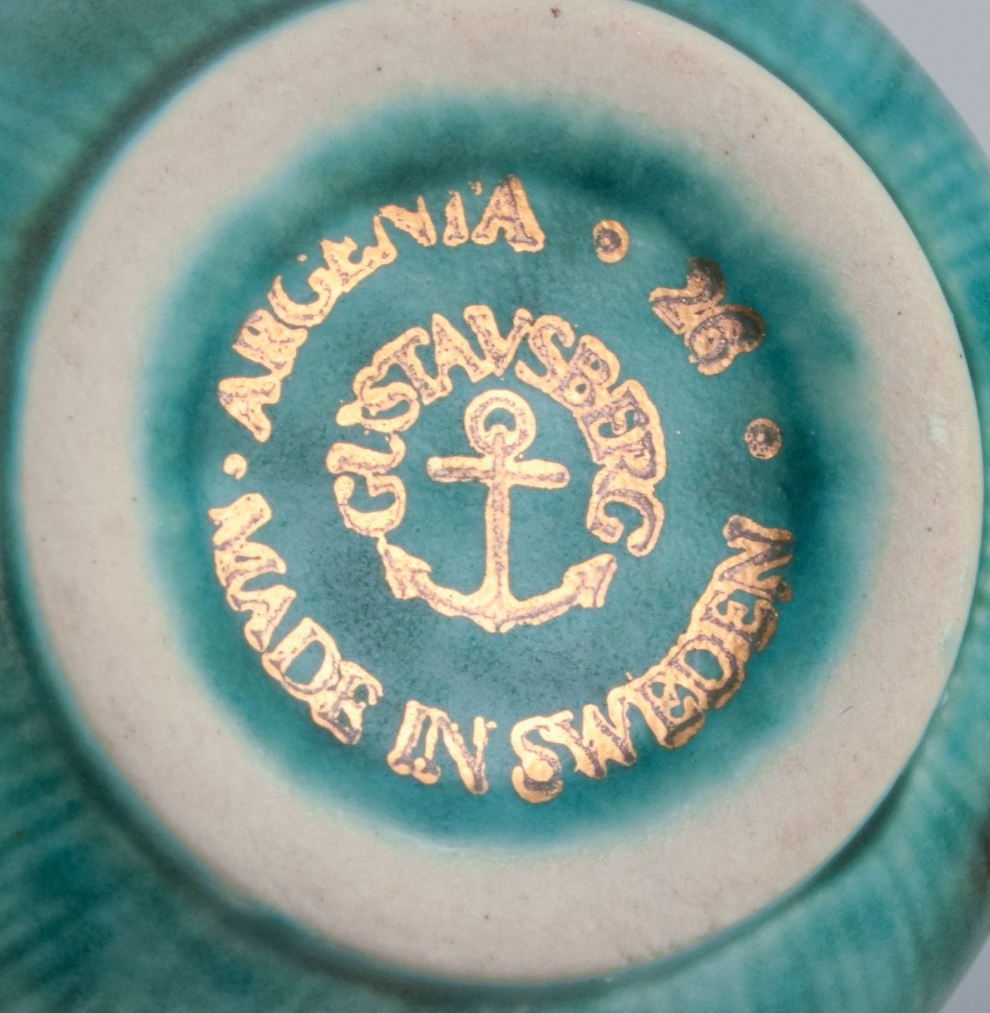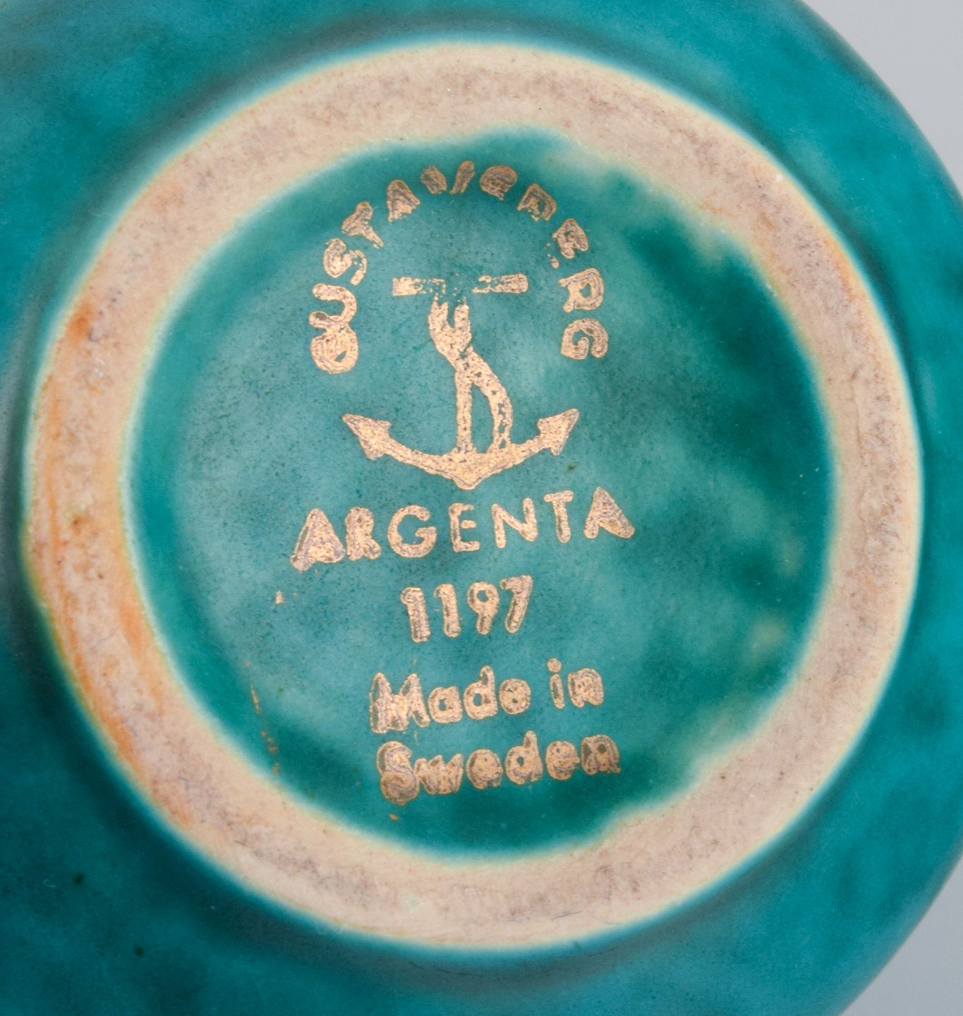 Wilhlem Kåge for Gustavsberg, Tre små ”Argenta” keramikvaser. Glasur i grønne toner med blade i for af sølvindlæg.