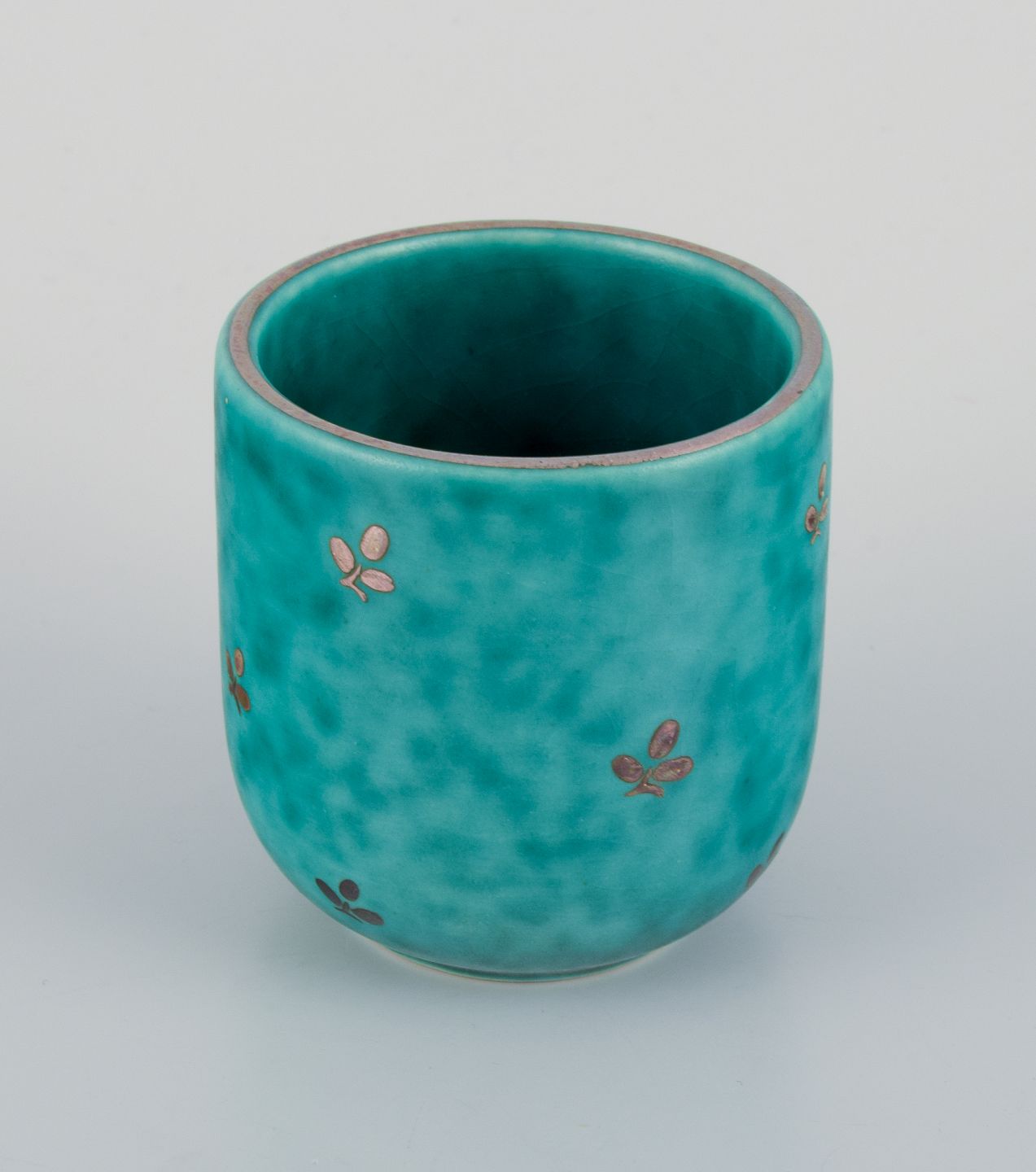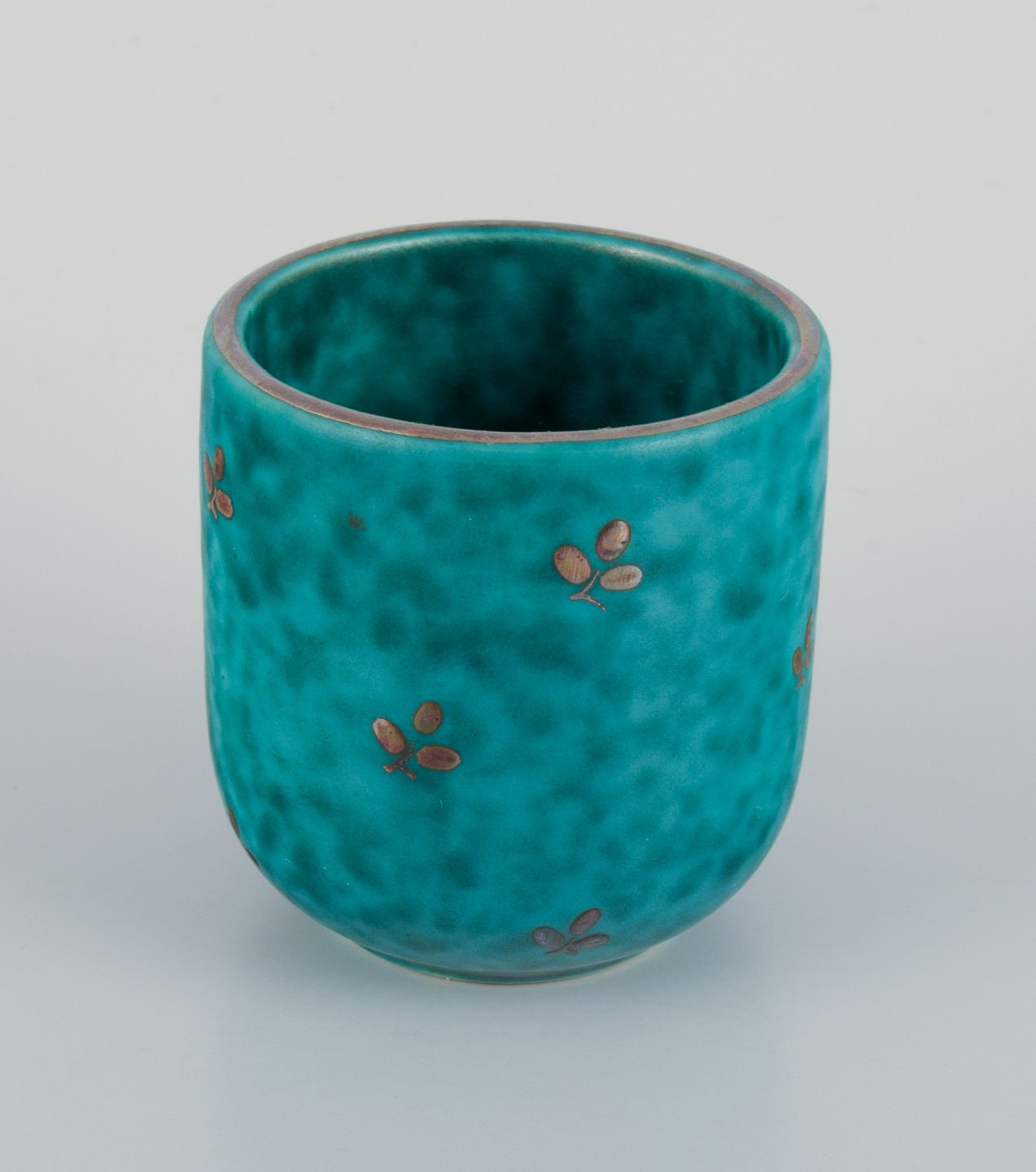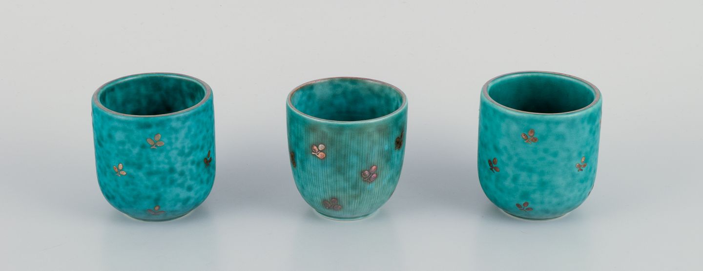 Wilhlem Kåge for Gustavsberg, Tre små ”Argenta” keramikvaser. Glasur i grønne toner med blade i for af sølvindlæg.