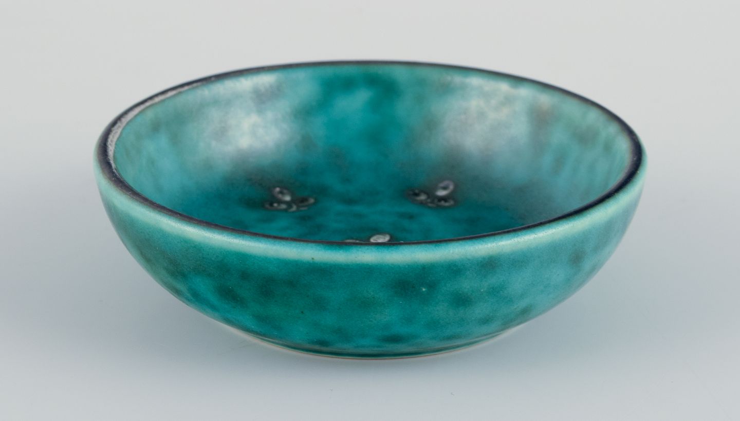 Wilhlem Kåge for Gustavsberg, et sæt på seks ”Argenta” keramikskåle. Glasur i grønne toner med blade i for af sølvindlæg.