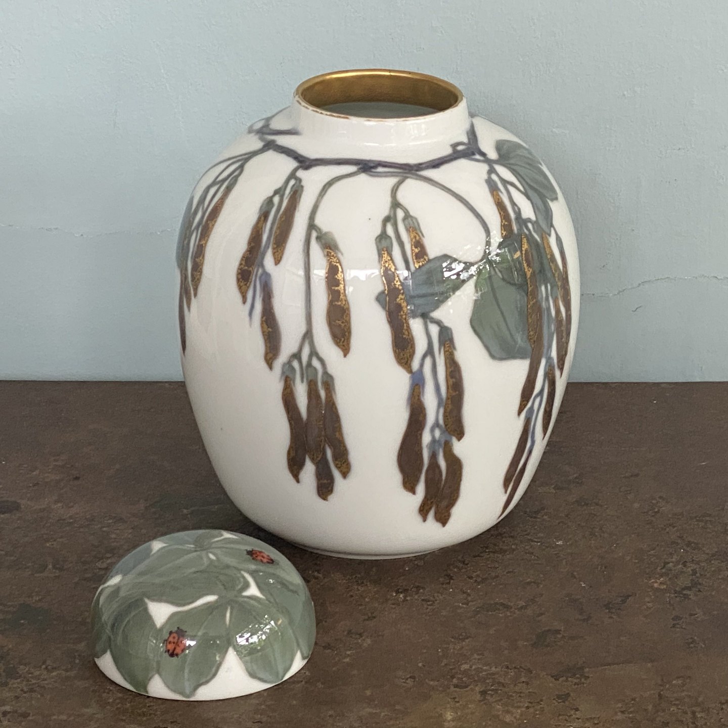 Royal Copenhagen lågkrukke / urne dekoreret i underglasur med guldregn og i overglasur med mariehøns og guld.