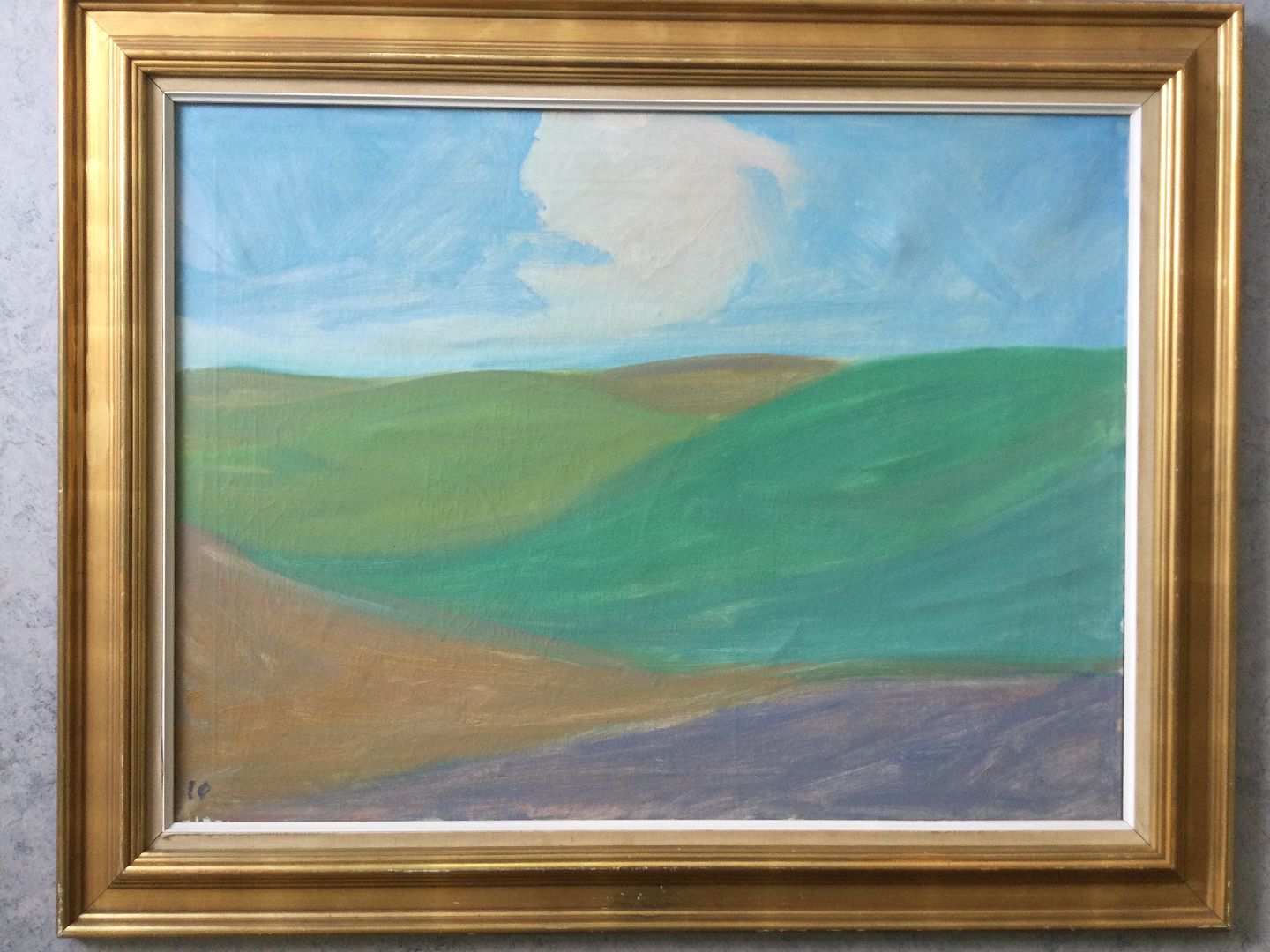 Maleri af Carl Østerbye - Bakket landskab med drivenden skyer.