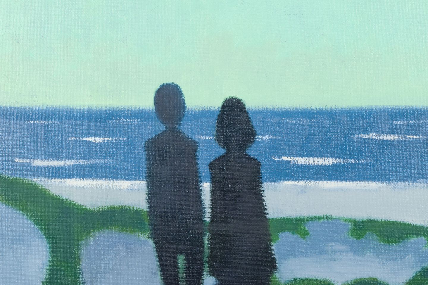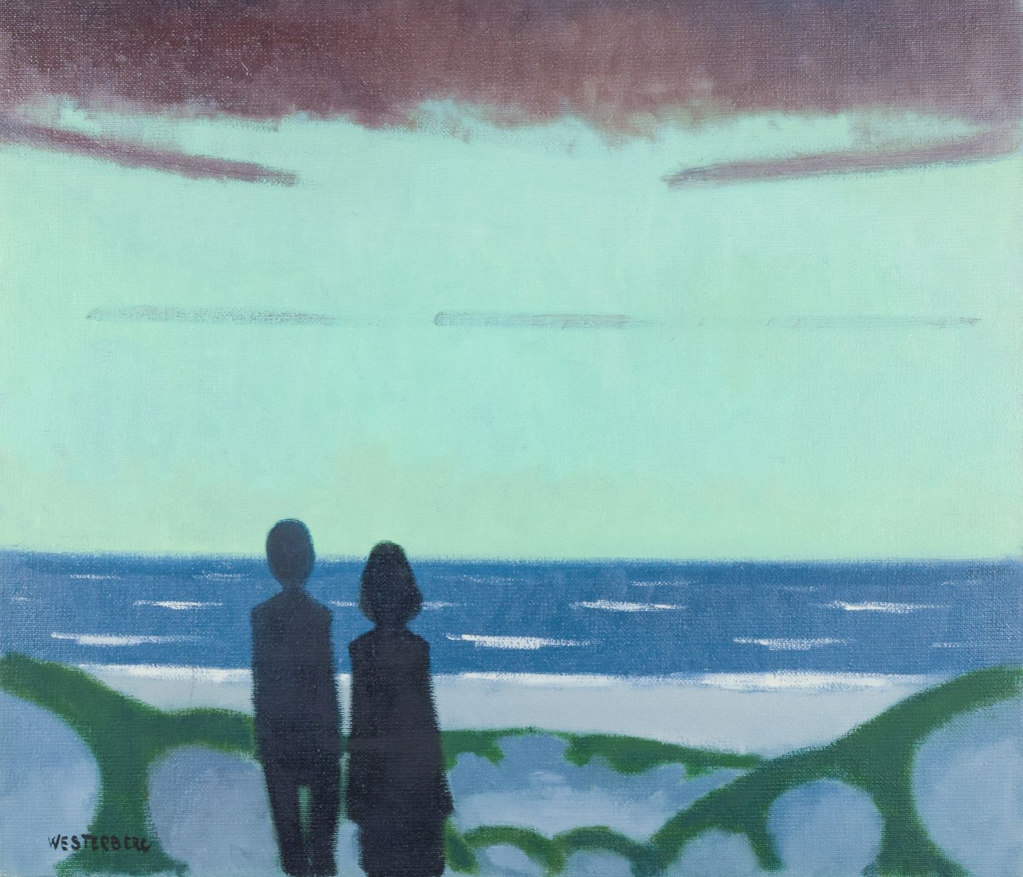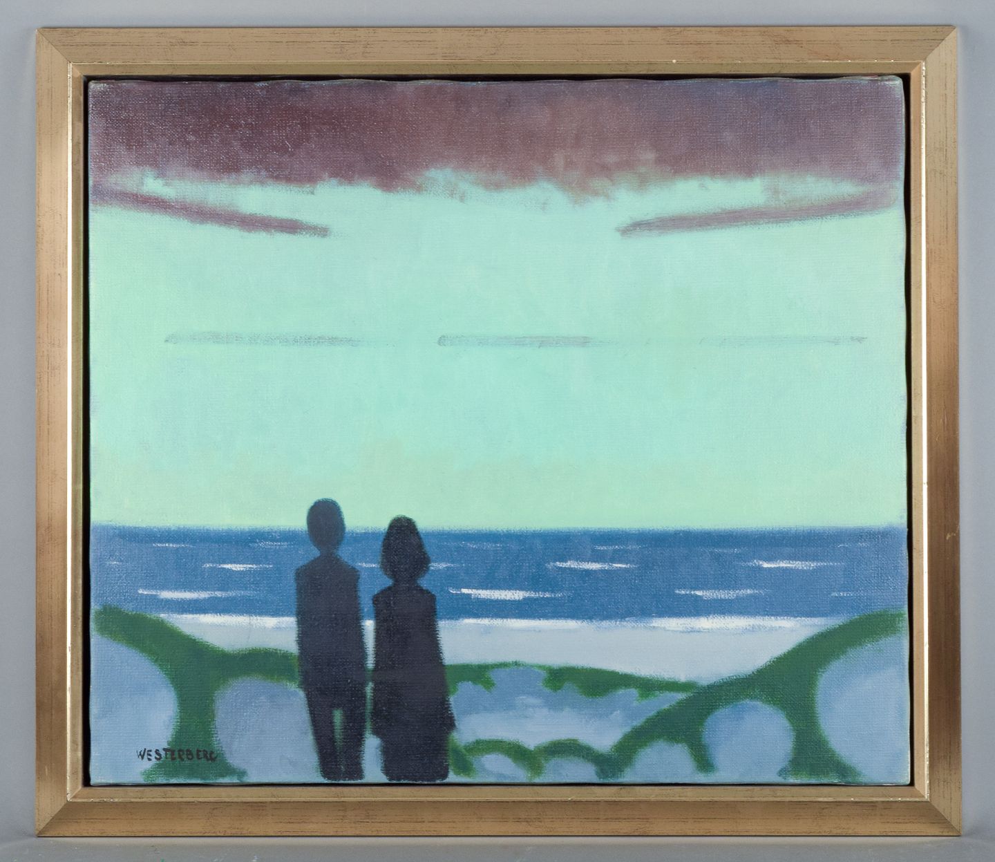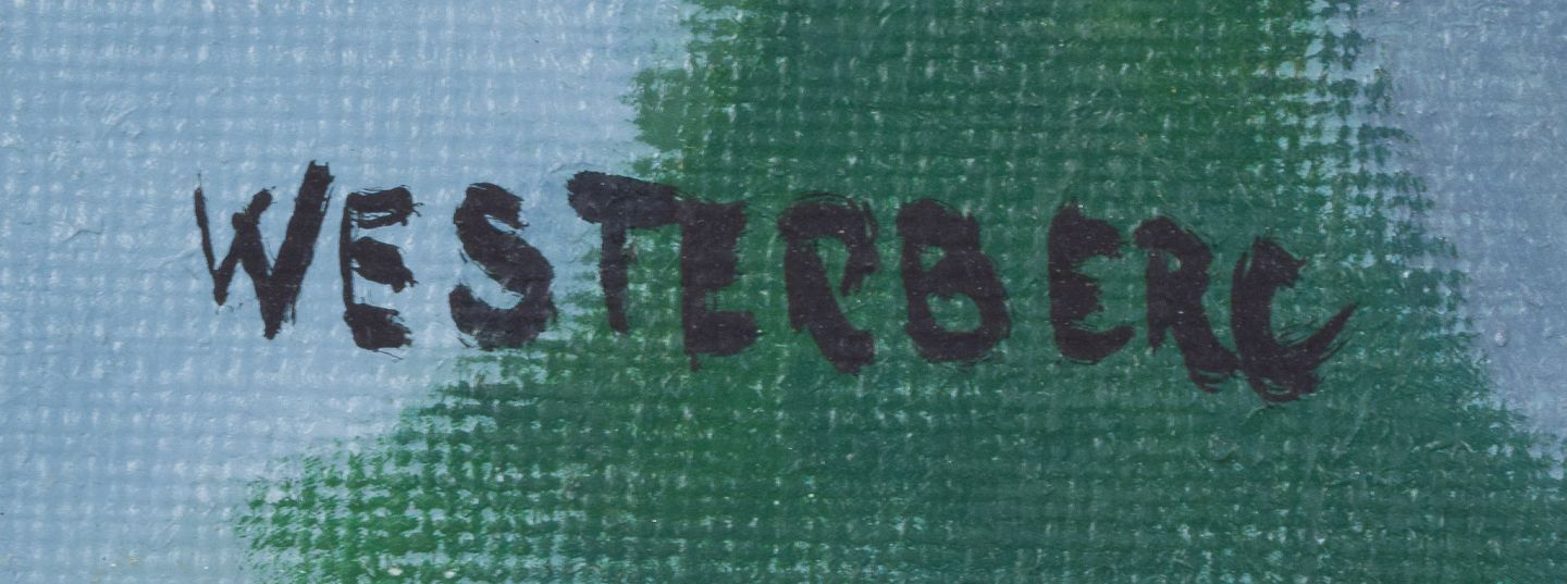 K. Westerberg alias Knud Horup, dansk kunstner, olie på lærred. Modernistisk stil. Landskab med figurer.