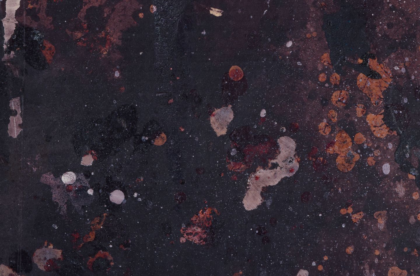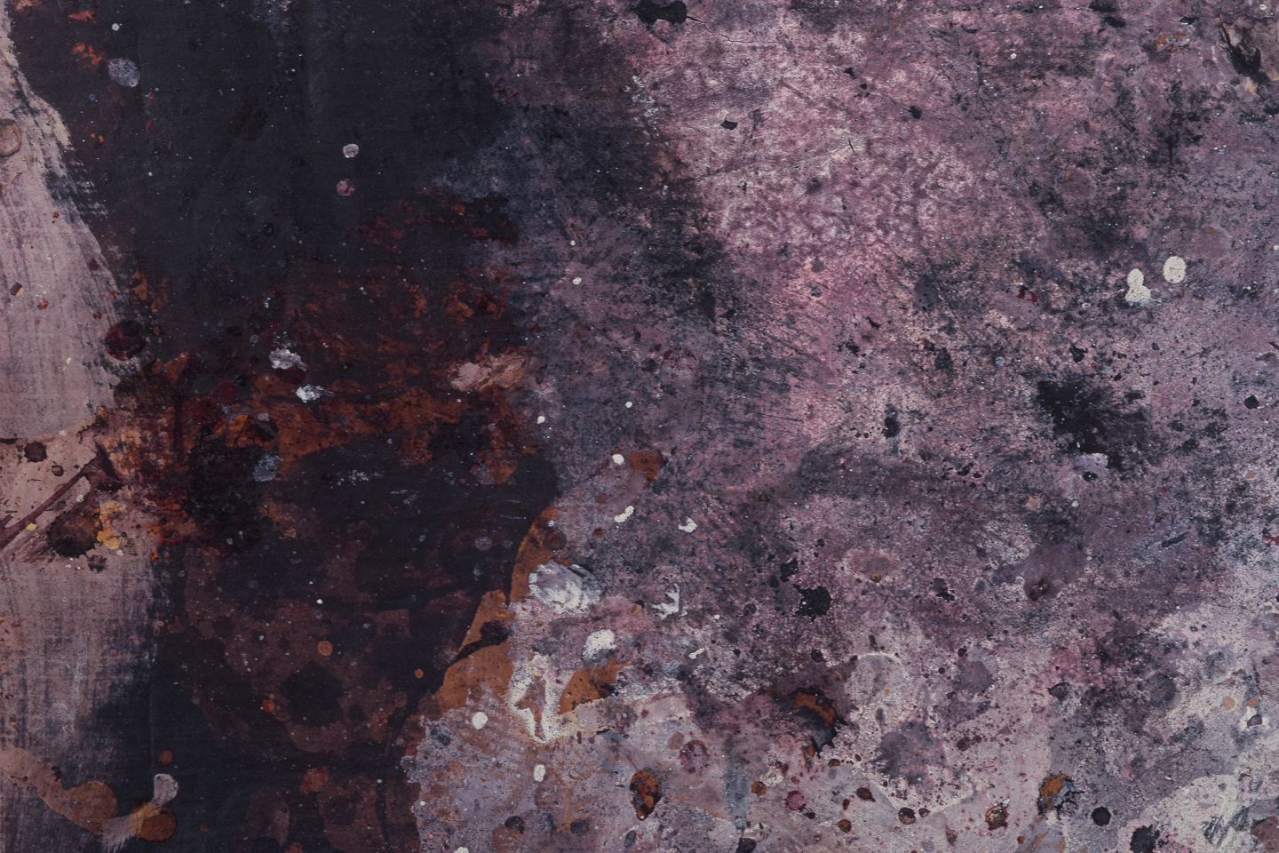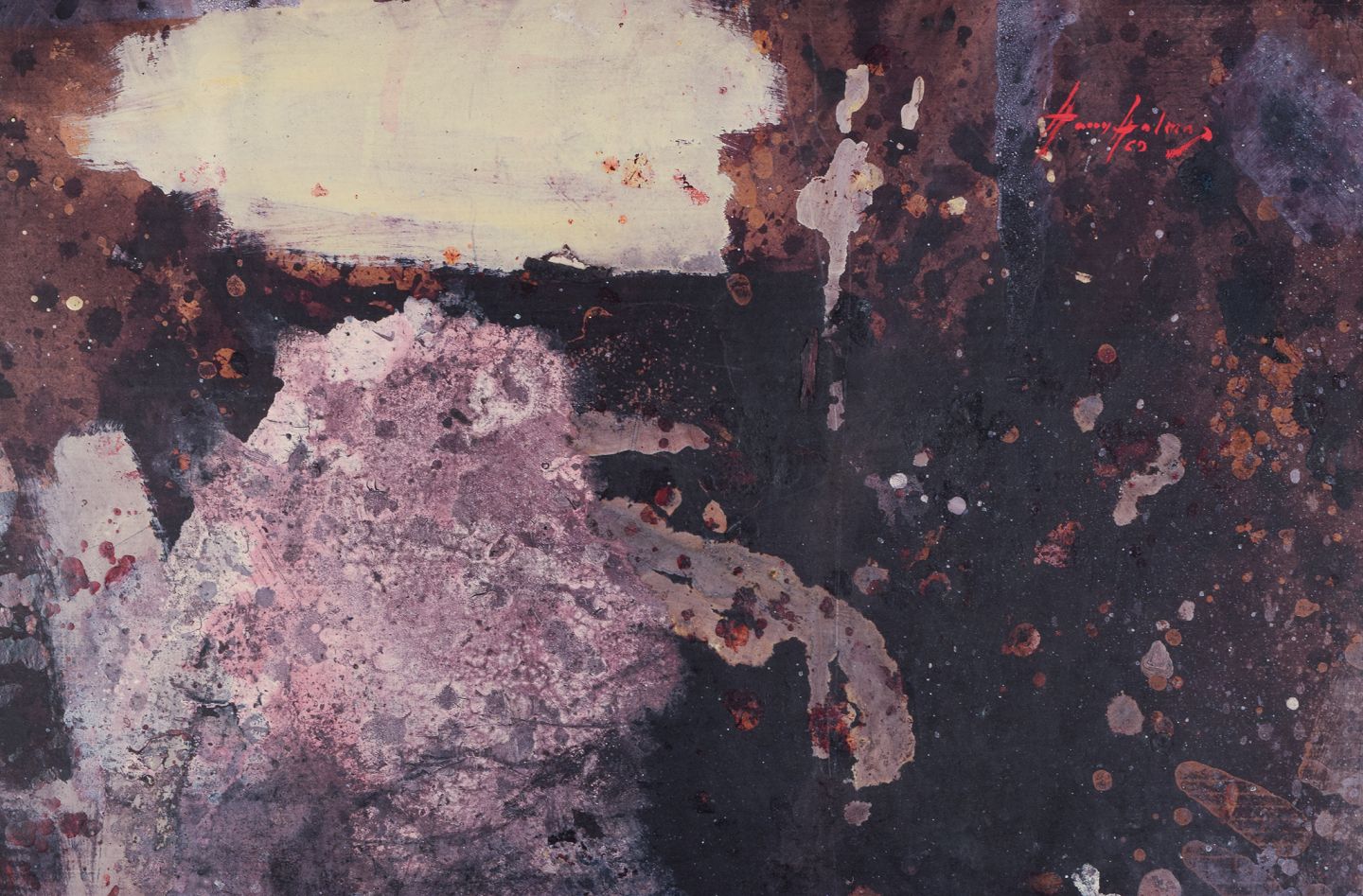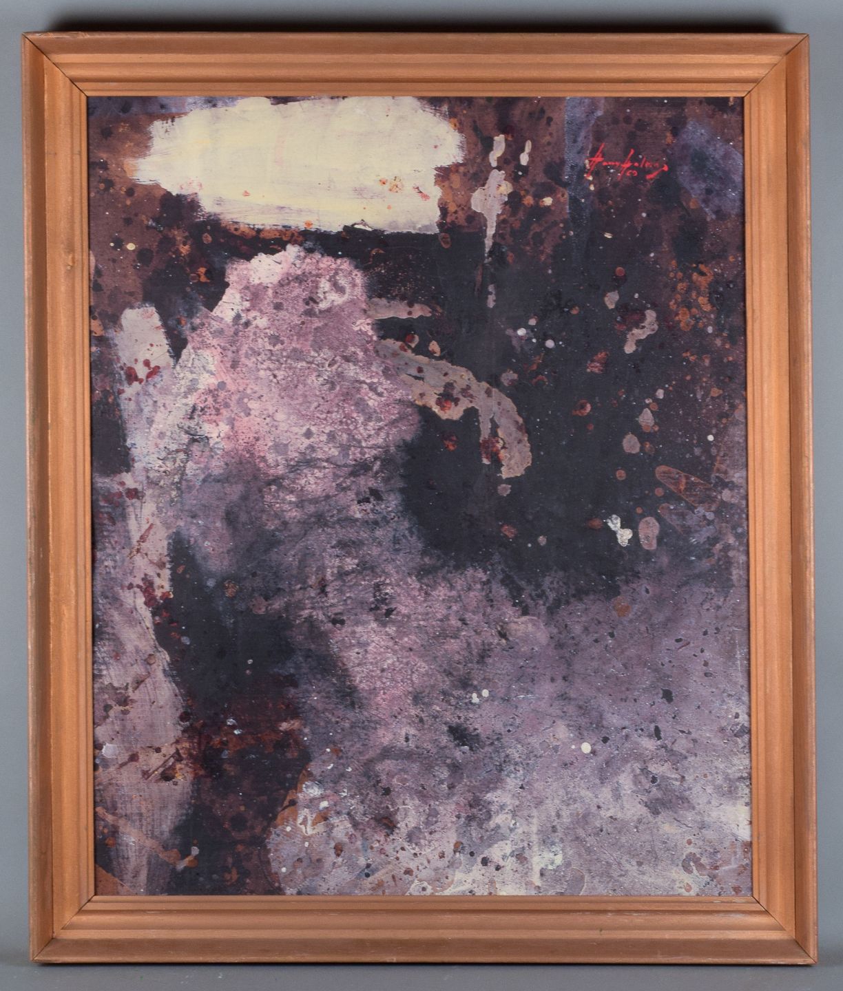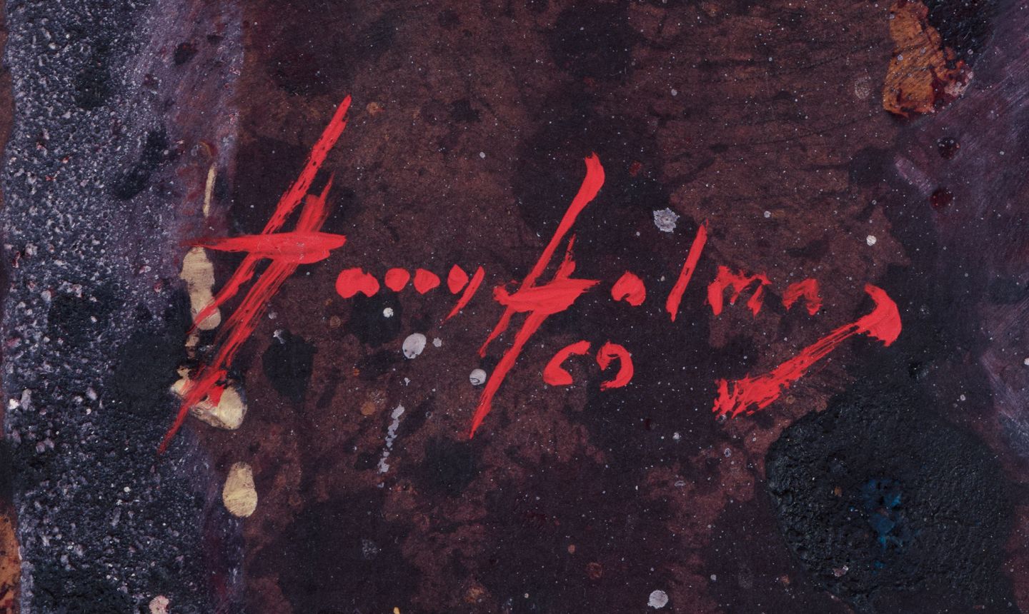 Harry Holma, svensk kunstner, mixed media på plade. Abstrakt psykedelisk komposition.