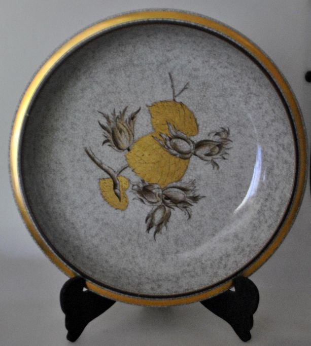 Royal Copenhagen craquelle fad, 20. årh. København, Danmark. 72/3606. Med forgyldning. Bemalet med nødder og blade. H,; 5,8 cm. Dia.: 25 cm. Stemplet.