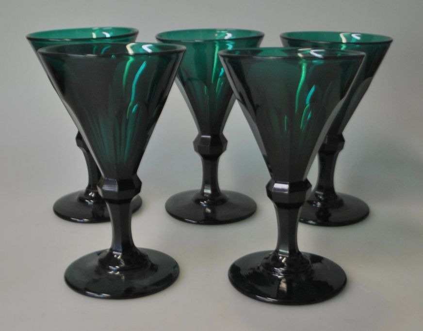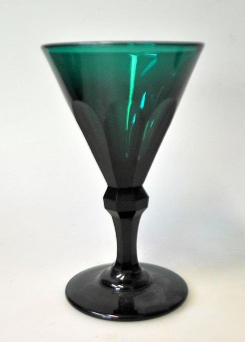 Grønne hvidvins glas af Anglais type, 19. årh. Mørk grønt glas. Med slibninger og octagon formet knob på stilk. H.: 12,5 cm.