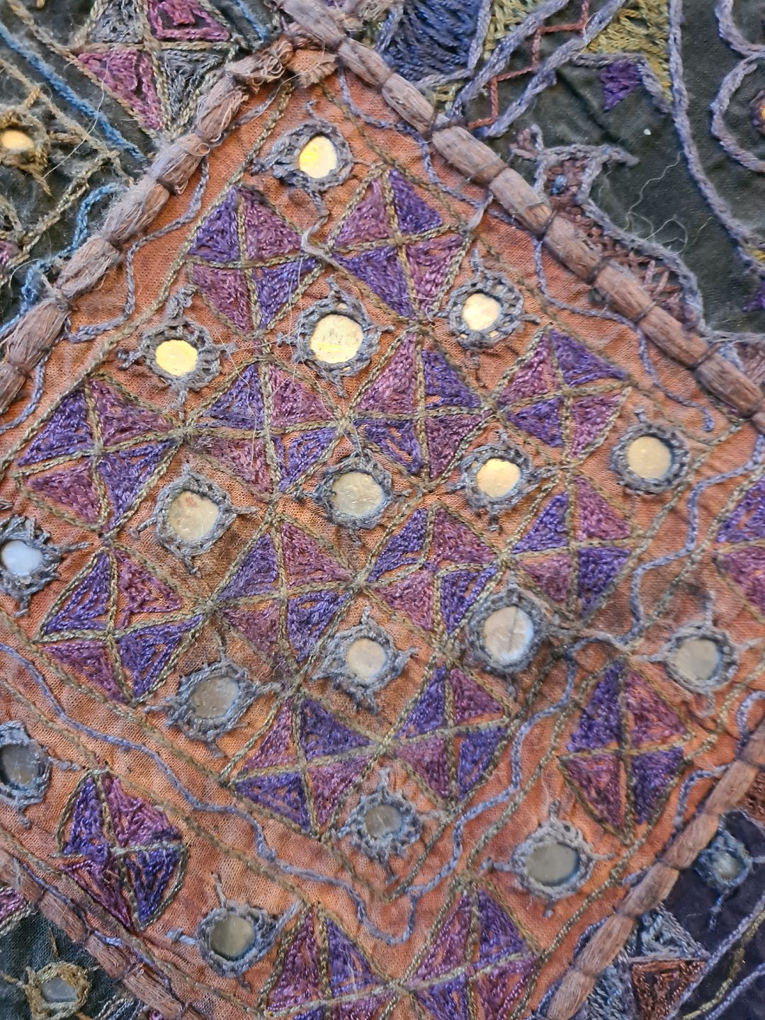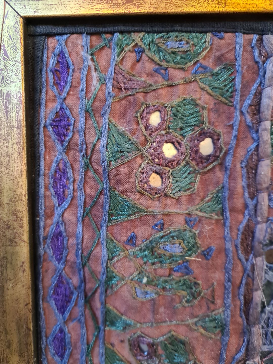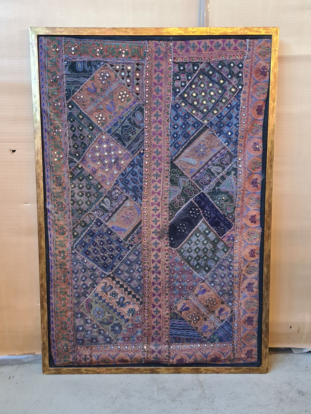 Indisk stof dekoration i guldmalet ramme, fra 1990erne.