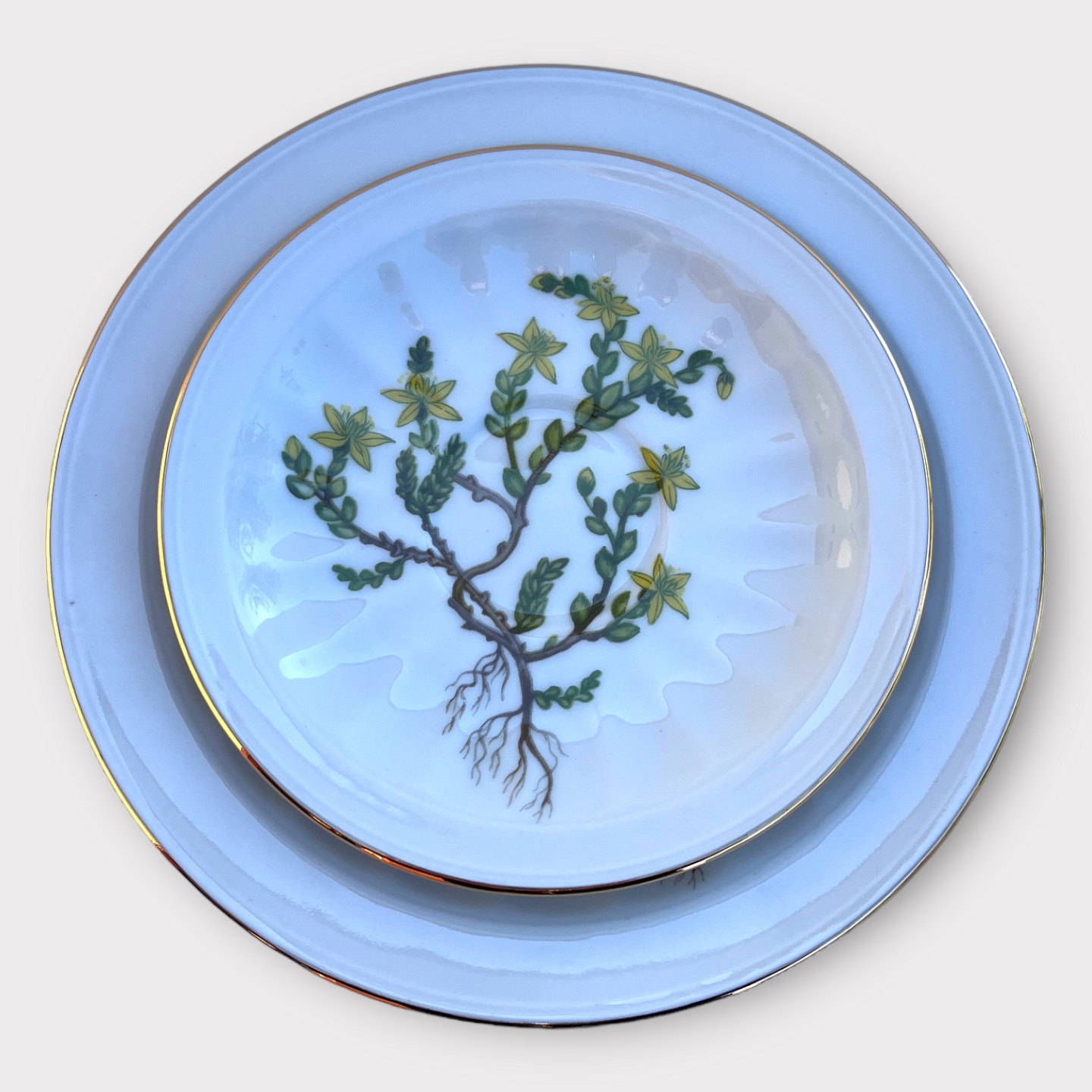 Firkløveren, Carl von Linné, Trio kaffesæt, Timian 1980, Kop 7cm høj, Tallerken 17cm i diameter *Perfekt stand*