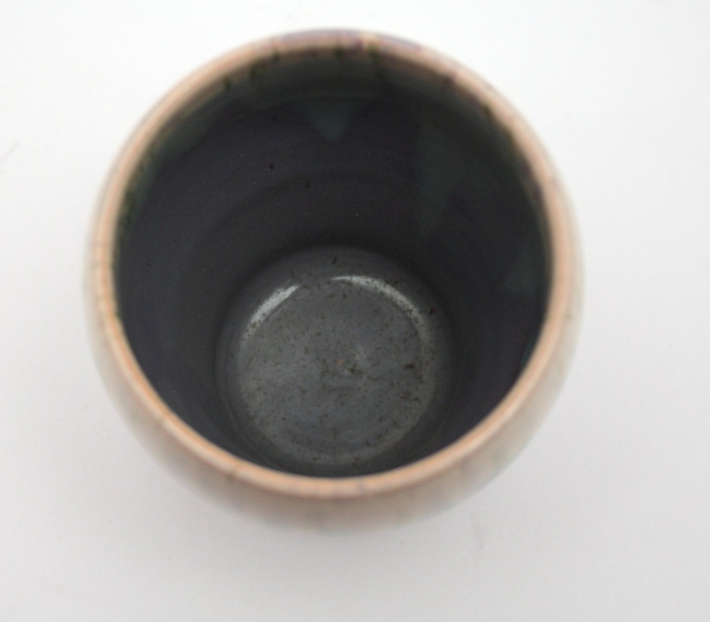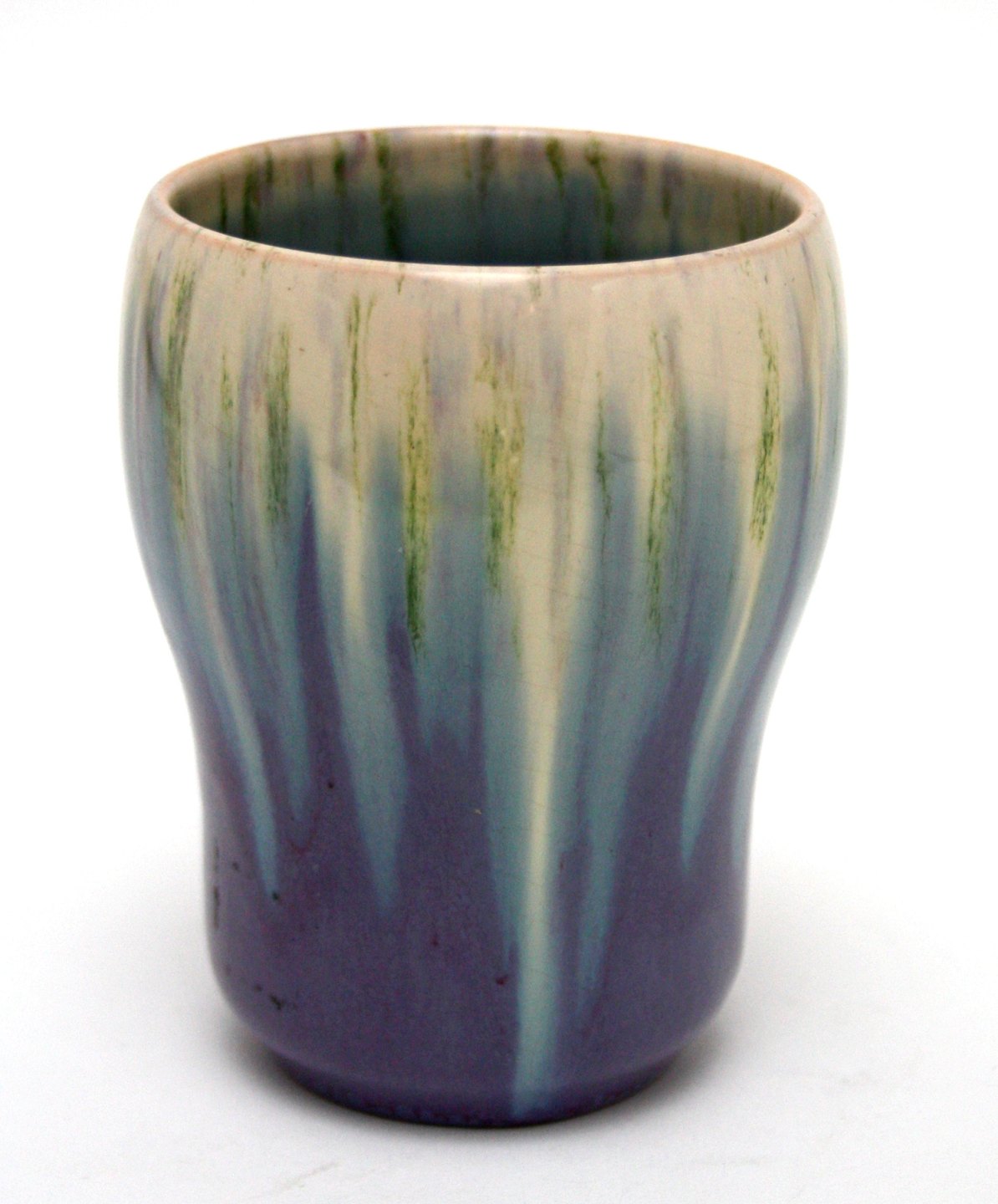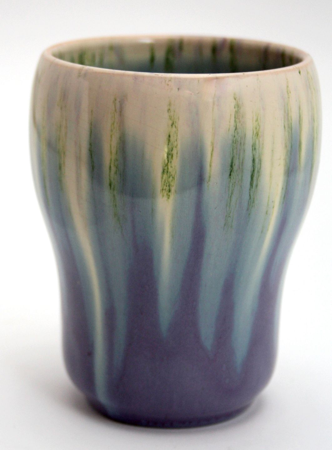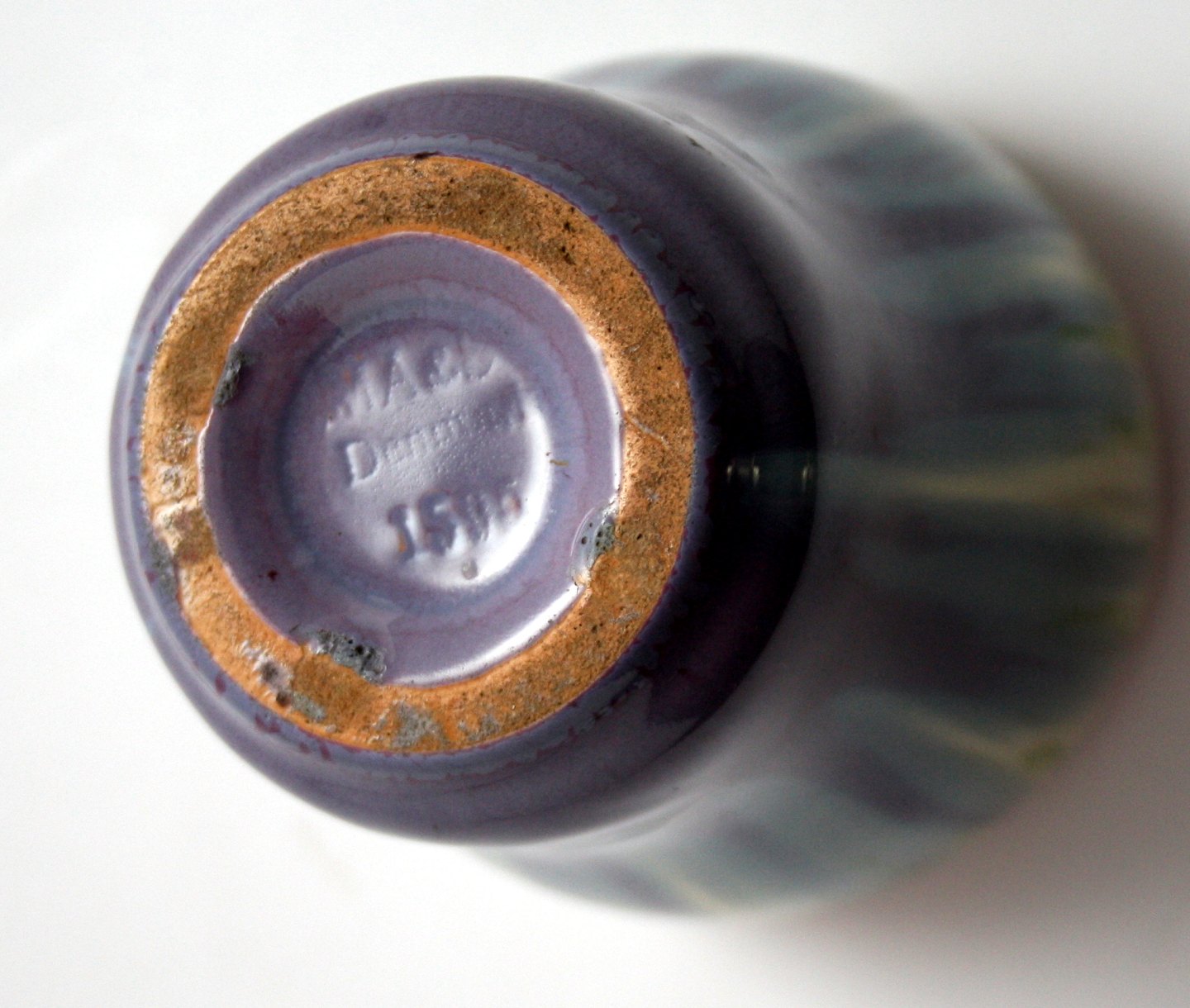 Text available in Danish: Michael Andersen & Søn, Bornholm, Lille vase med løbeglasur i lilla, lys blå, grøn og lyse farver. Stemplet MA&S Danmark utydeligt nr. men antageligt 1505. Højde 10 cm. Øverste diameter 7 cm. Flot stand. Pris: 525 kr.