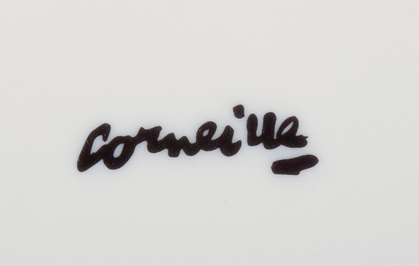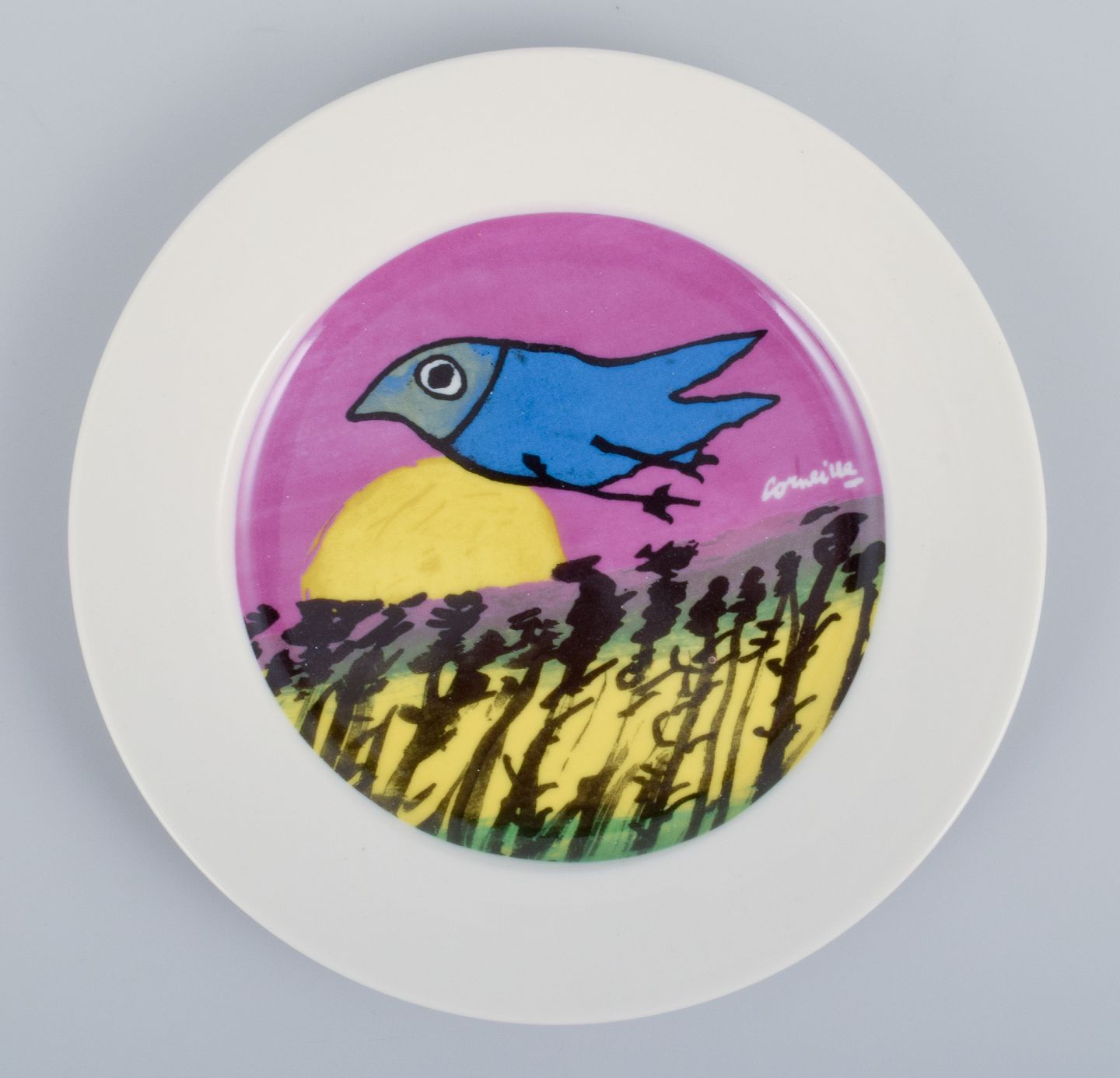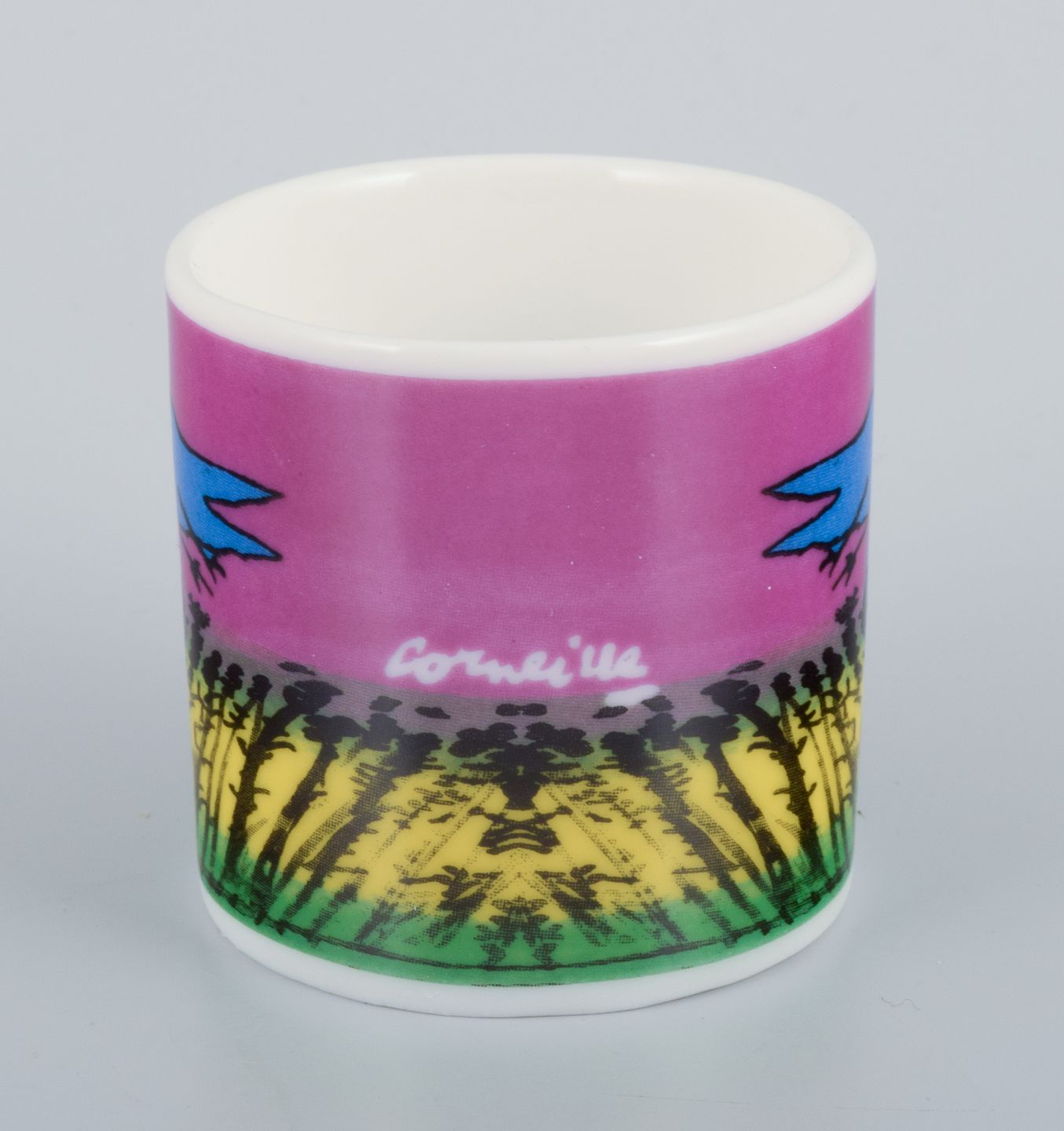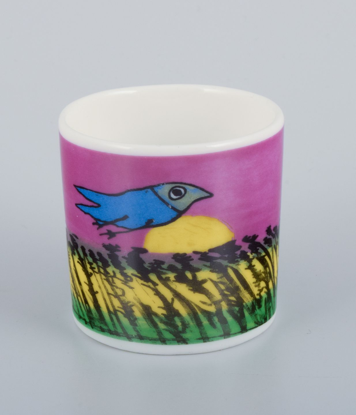 Corneille (Guillaume Cornelis van Beverloo), hollandsk CoBrA kunstner (1922-2010). Kaffekop, tallerken og æggebæger i porcelæn dekoreret med fugle over mark med solopgang.