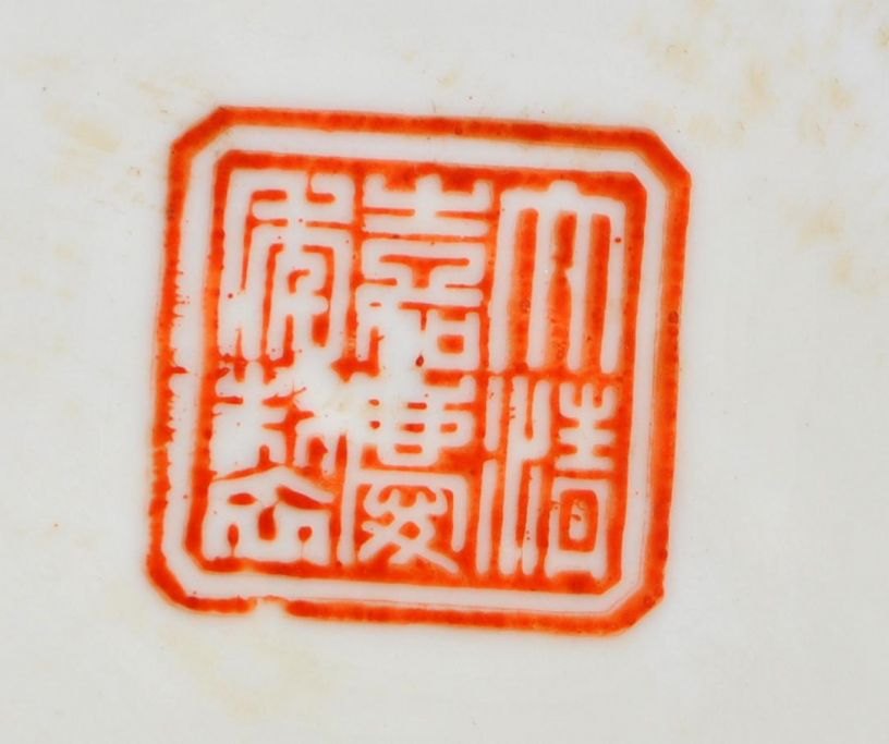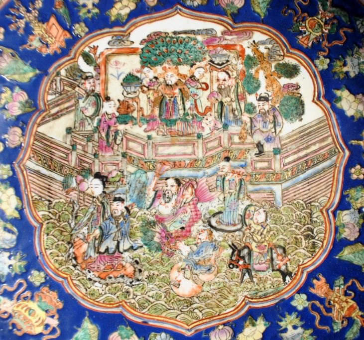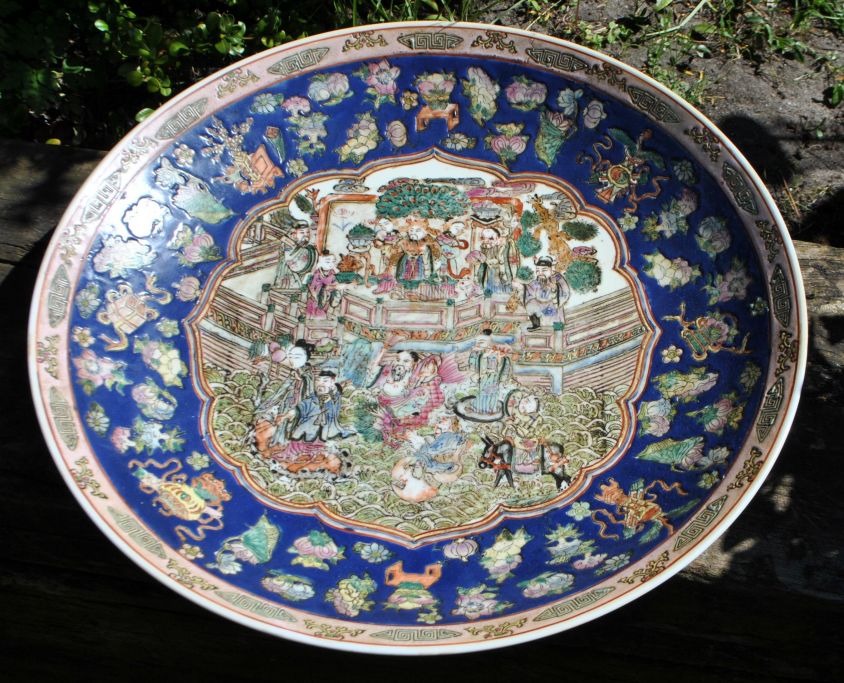 Stort kinesisk porcelæns fad, 20. årh. Famille rose. Hånddekoreret med scene med kejser. Stemplet. 45,5 cm.