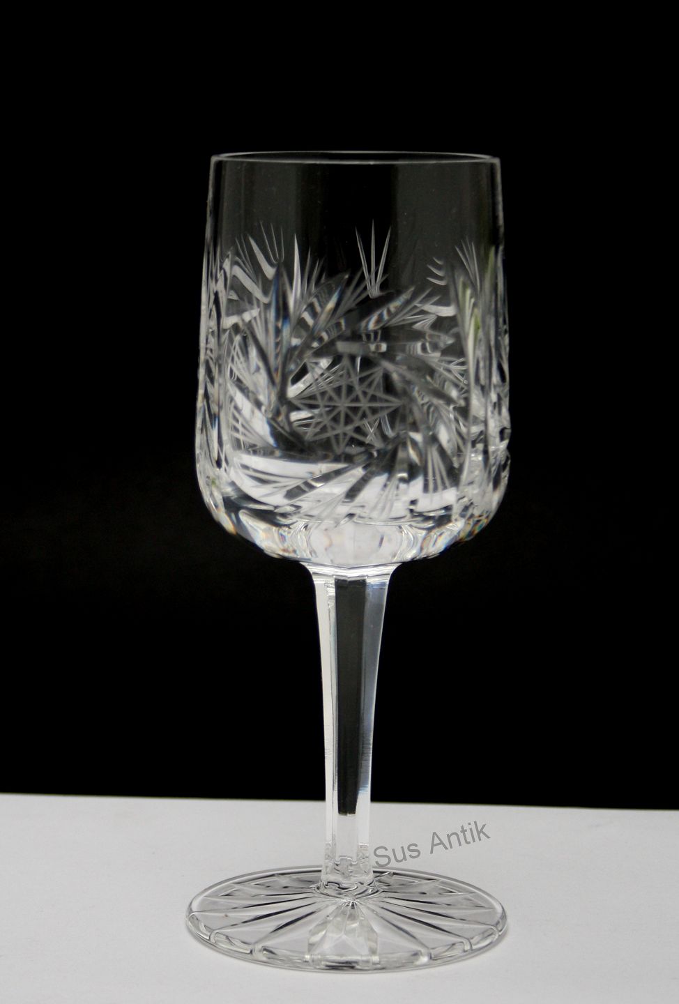 Lyngby glasværk, Granada, Hvidvin. Mundblæst og håndslebet 24 % Bøhmisk blykrystal med slibninger på kumme, slebet stilk og stjerneslebet fod. Importeret fra Tjekkiet i 1970'erne og solgt via Lyngby glasværk.