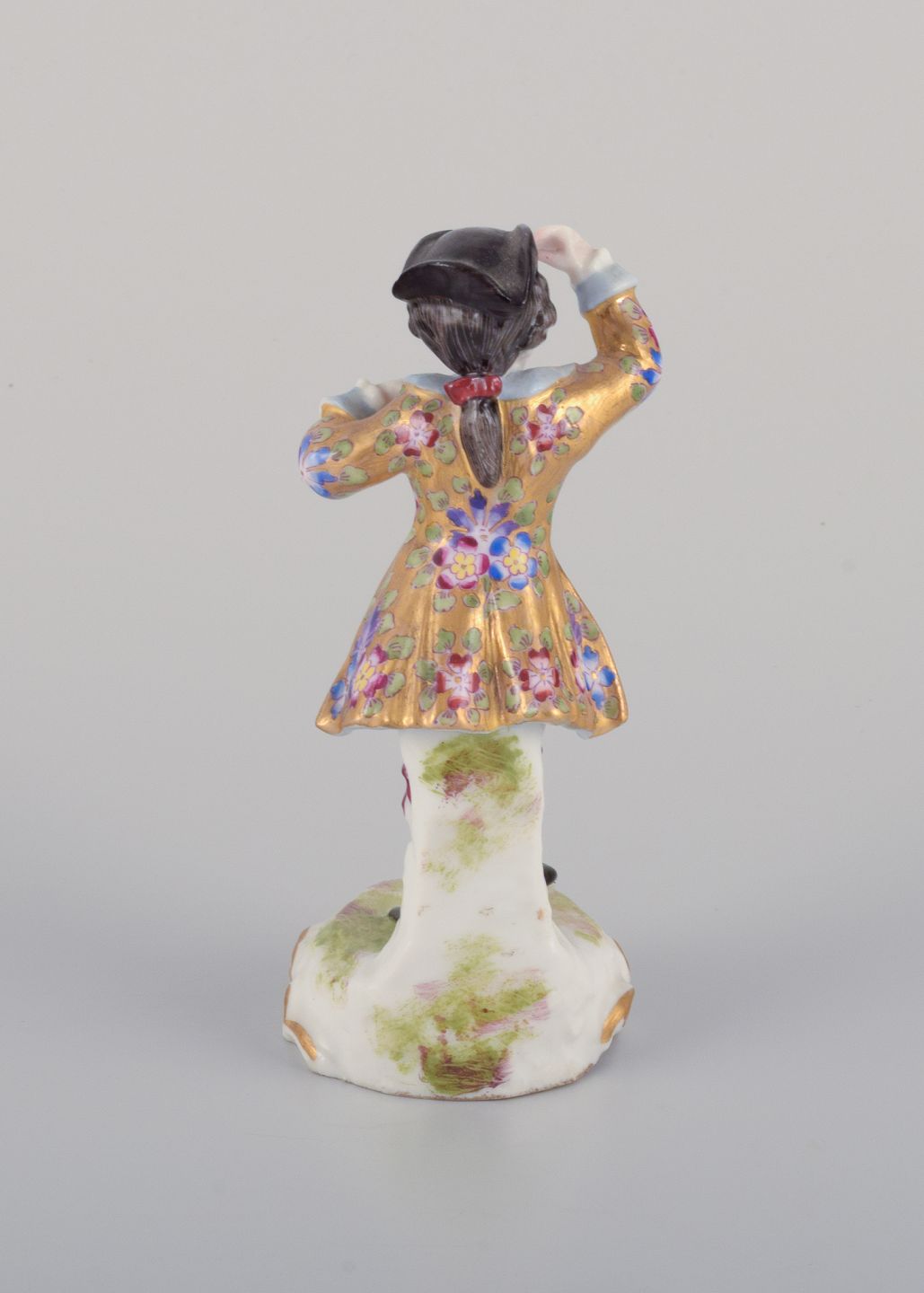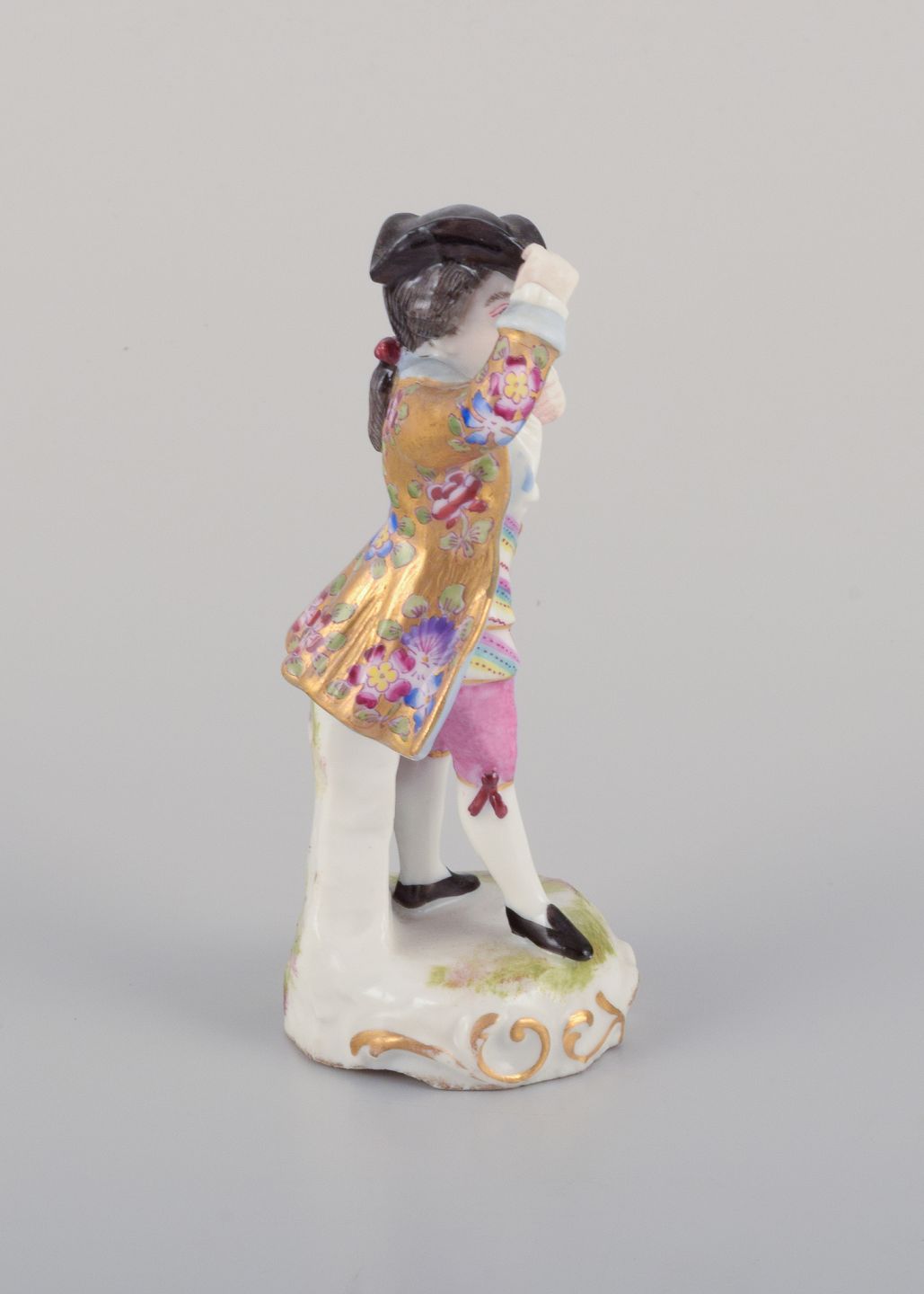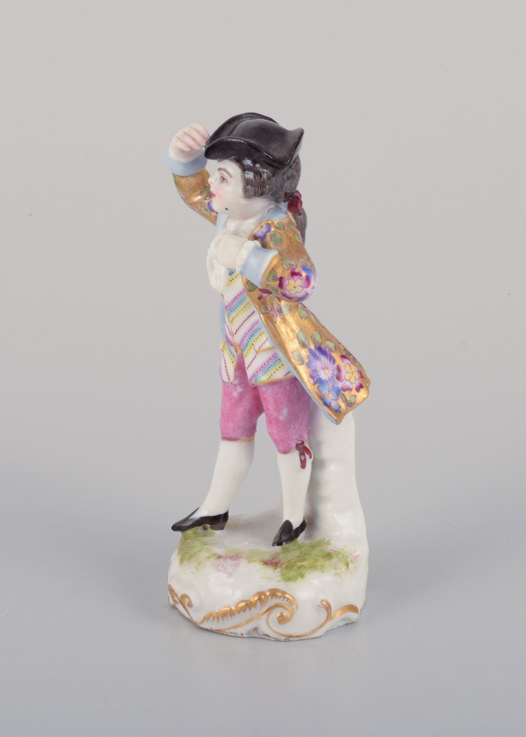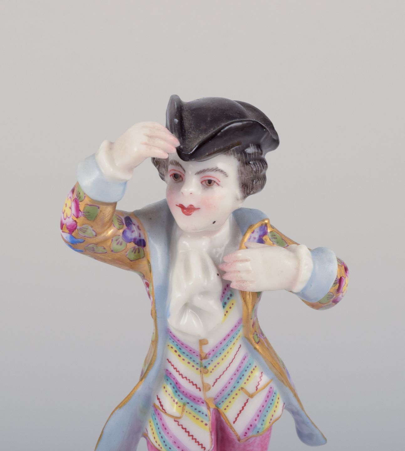 Meissen, Tyskland, porcelænsfigur af ung mand i fine klæder. Håndmalet i polykrome farver.