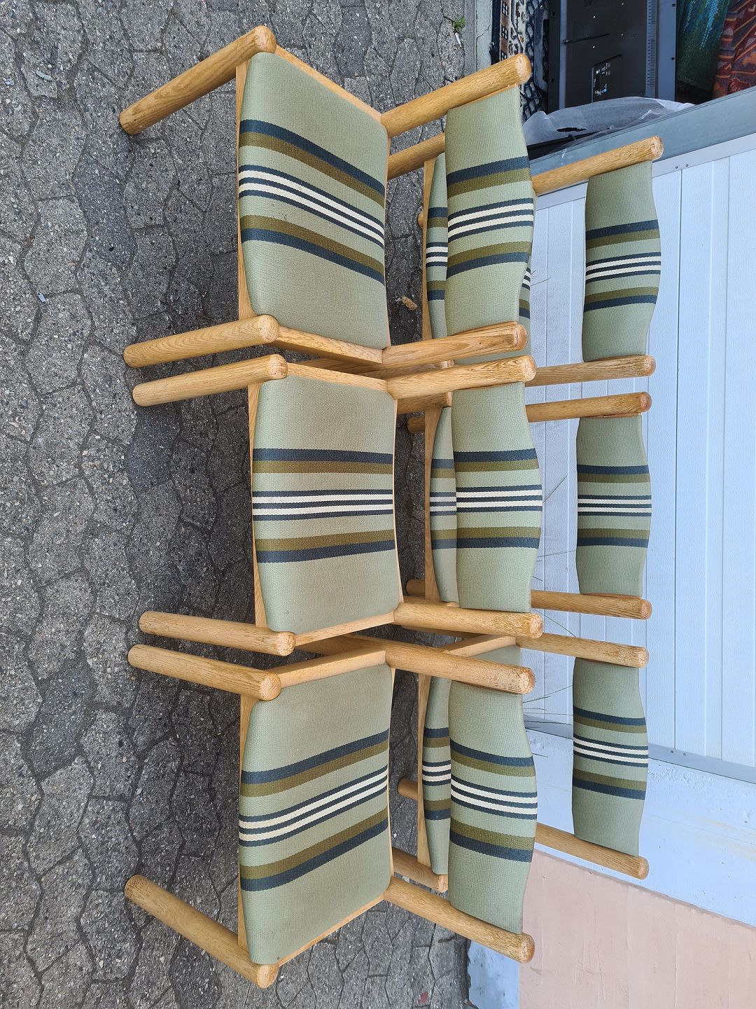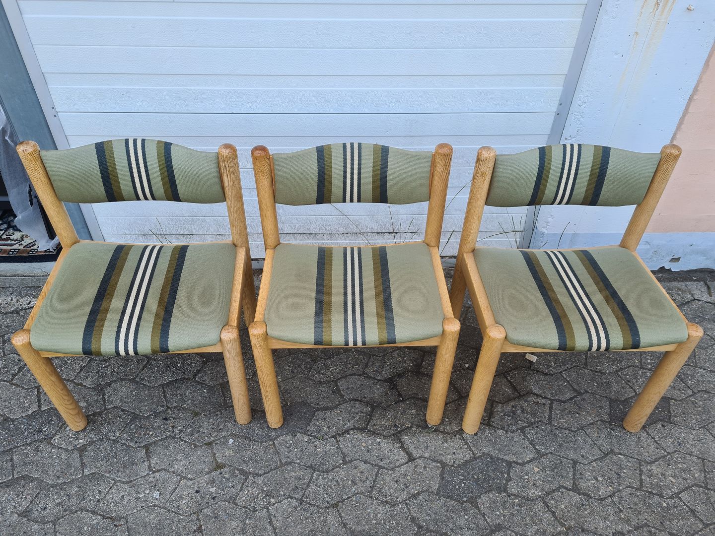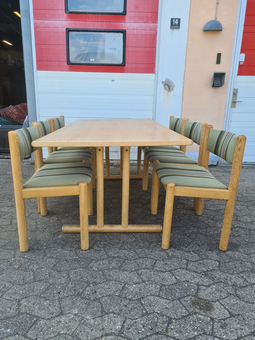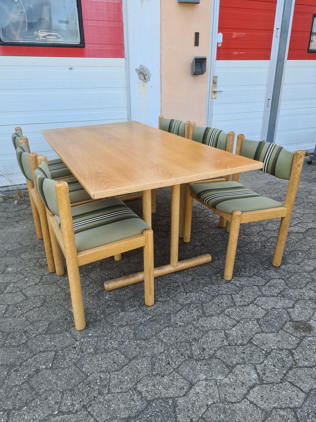Text available in Danish: Bord i fineret egetræ med 6 stole, fra 1980erne.
