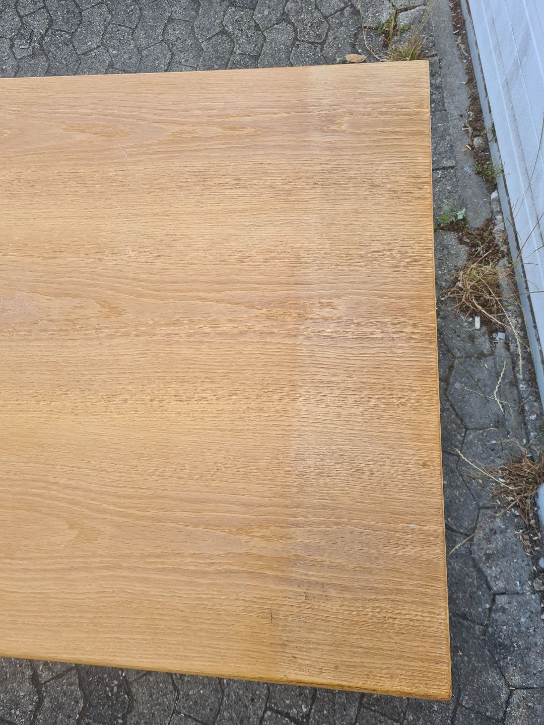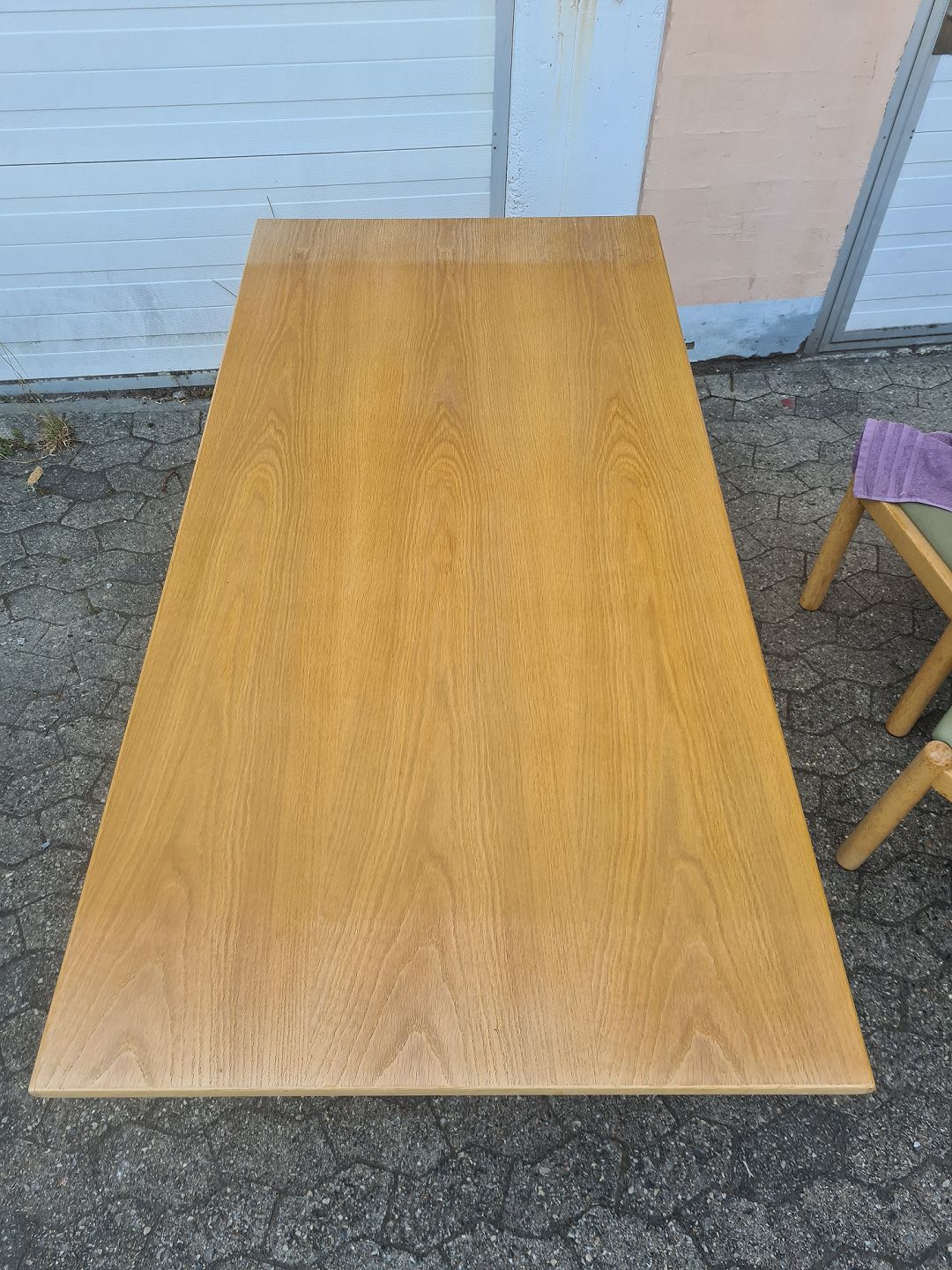 Bordet har brugsspor på pladen og stolene har slidt betræk.
