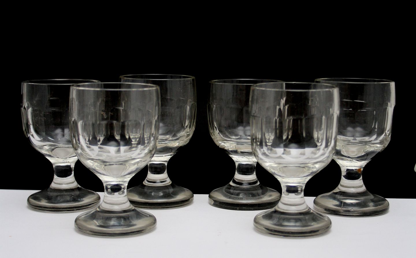 Toddyglas med oliveslibning, tykvægget kumme og fod. Knækket og plansleben fod. Fra starten af 1900 tallet. Højde 10,5-11 cm. Diameter 6,5 cm. 1 med afslag på kumme. 6 stk sælges samlet. Pris: 475 kr. samlet.