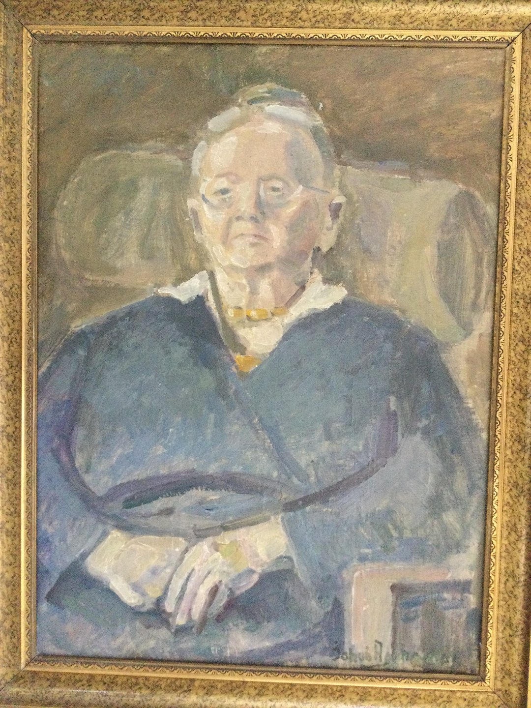 Siddende, ældre kvinde i interiør 1945.