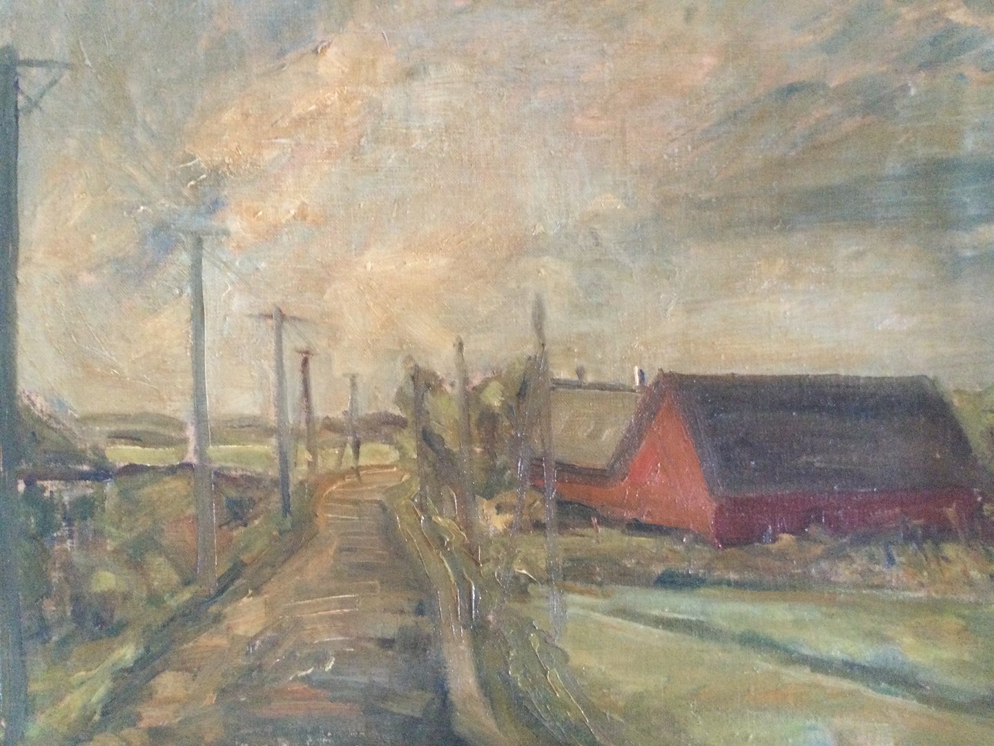 Maleri af Margrethe Loerges - Vej gennem by med telefonmaster.